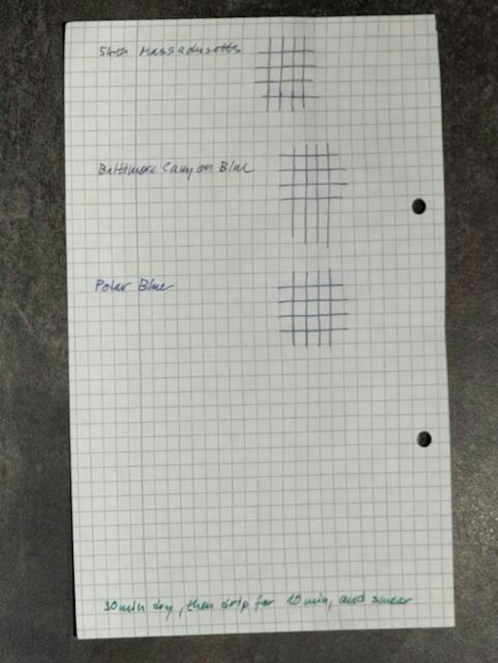 3oz (90ml) glass bottle of Noodler's 54th Massachusetts fountain pen ink. 54th Massachusetts is a bulletproof, legal blue-black. Noodler's inks are handcrafted, so there may be slight color variations from batch to batch.