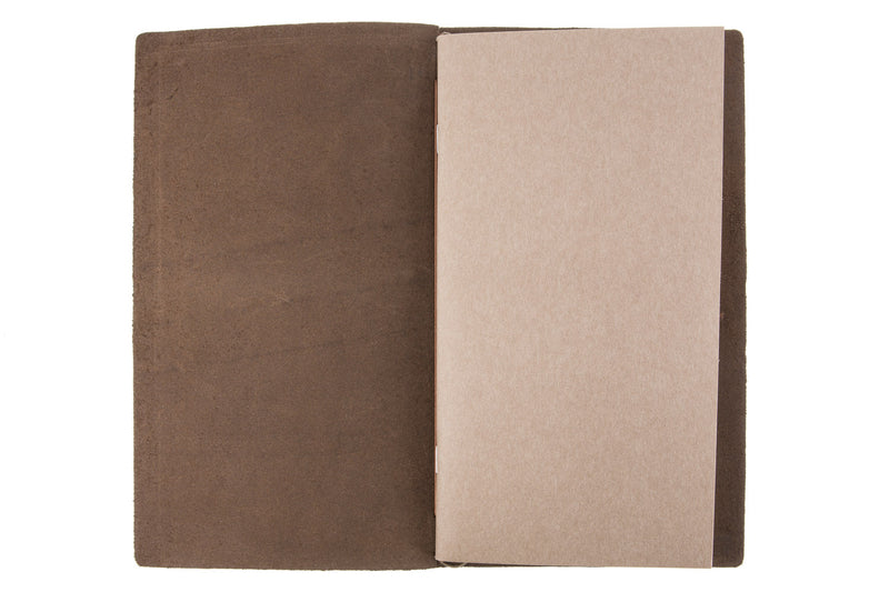 This is the starter's kit of the regular-sized Traveler's Notebook. It comes in a package which contains a brown cowhide leather cover, a blank notebook, a cotton case, and a spare closure rubber band (of a different color). The simple and rustic texture is self-assertive in an unobtrusive way.