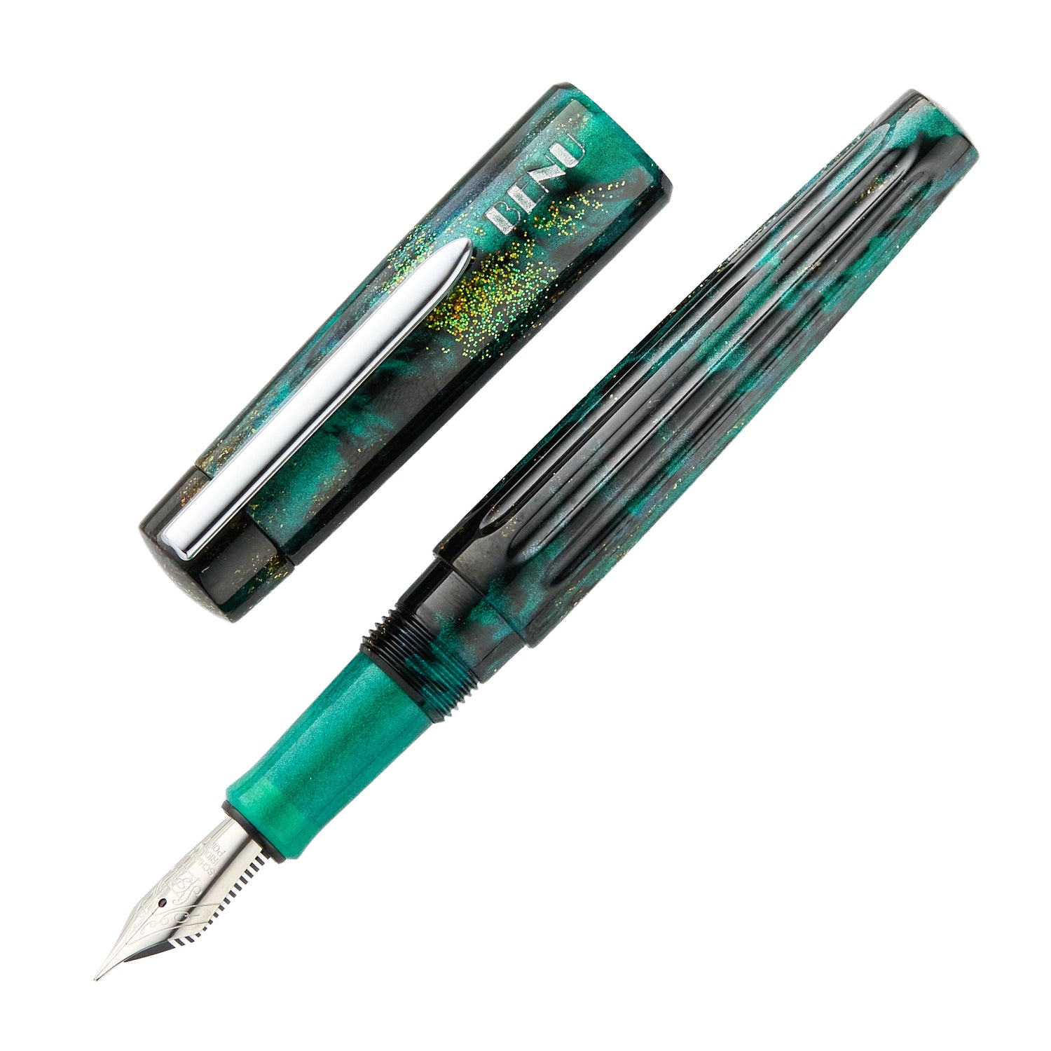 This BENU DailyMate fountain pen features a green and black resin base with gold glitter patches throughout. It has a silver Schmidt #6 stainless steel nib and a silver clip.