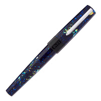 The Euphoria features facets and an ergonomic design for long periods of comfortable writing. This resin fountain pen features a dark blue base with large multi-colored holographic sparkles throughout. It has a silver Schmidt #6 stainless steel nib, a black resin grip and accents, a silver clip, and pushes to post.