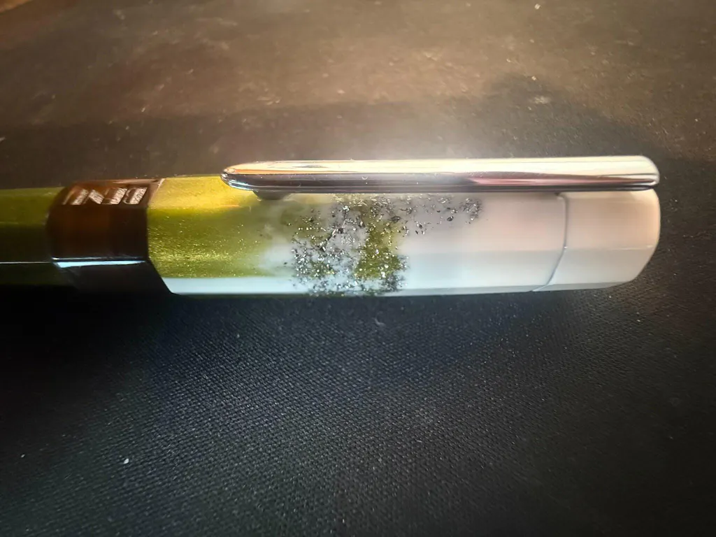 Inspired by a matcha latte, this faceted resin fountain pen has a green barrel with silver flecks throughout the barrel and a white and green cap, all replicating the drink. It also has a green grip section and centerband. Real matcha powder is infused into the material. It's stunning and unlike anything we've seen!