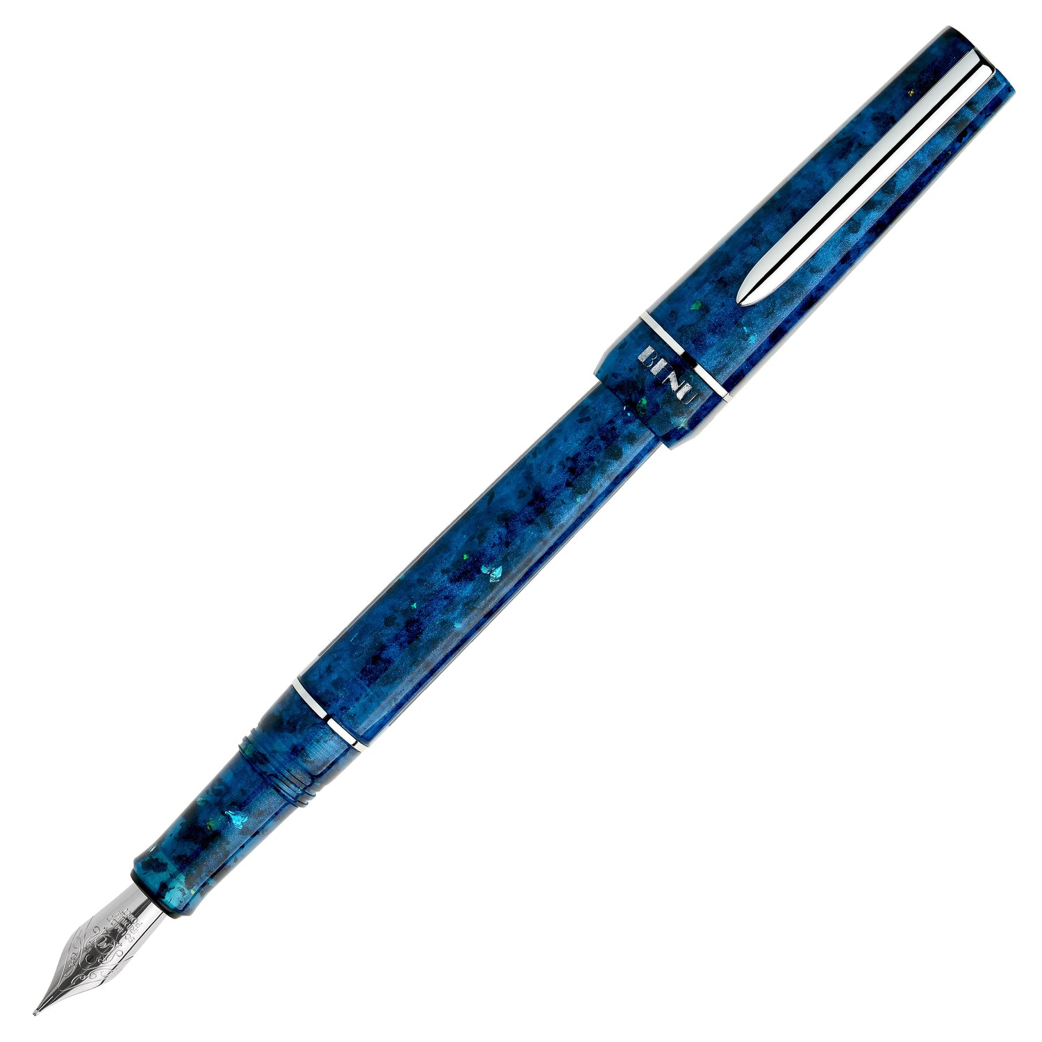 This fountain pen has a stunning blue body, a silver Schmidt #6 stainless steel nib, silver accents, a silver clip, and pushes to post.