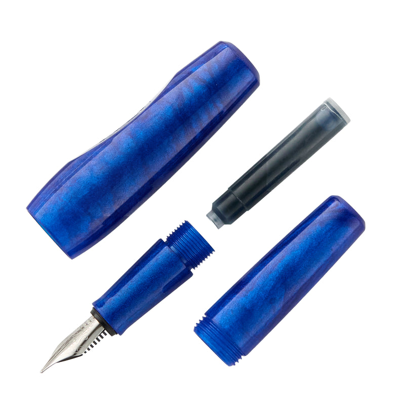 It comes with a blue standard international short ink cartridge. You can also fill the whole barrel with ink to use as an eyedropper pen with a larger ink capacity. A mini standard international converter (such as the Kaweco foldable converter) is available for purchase separately.