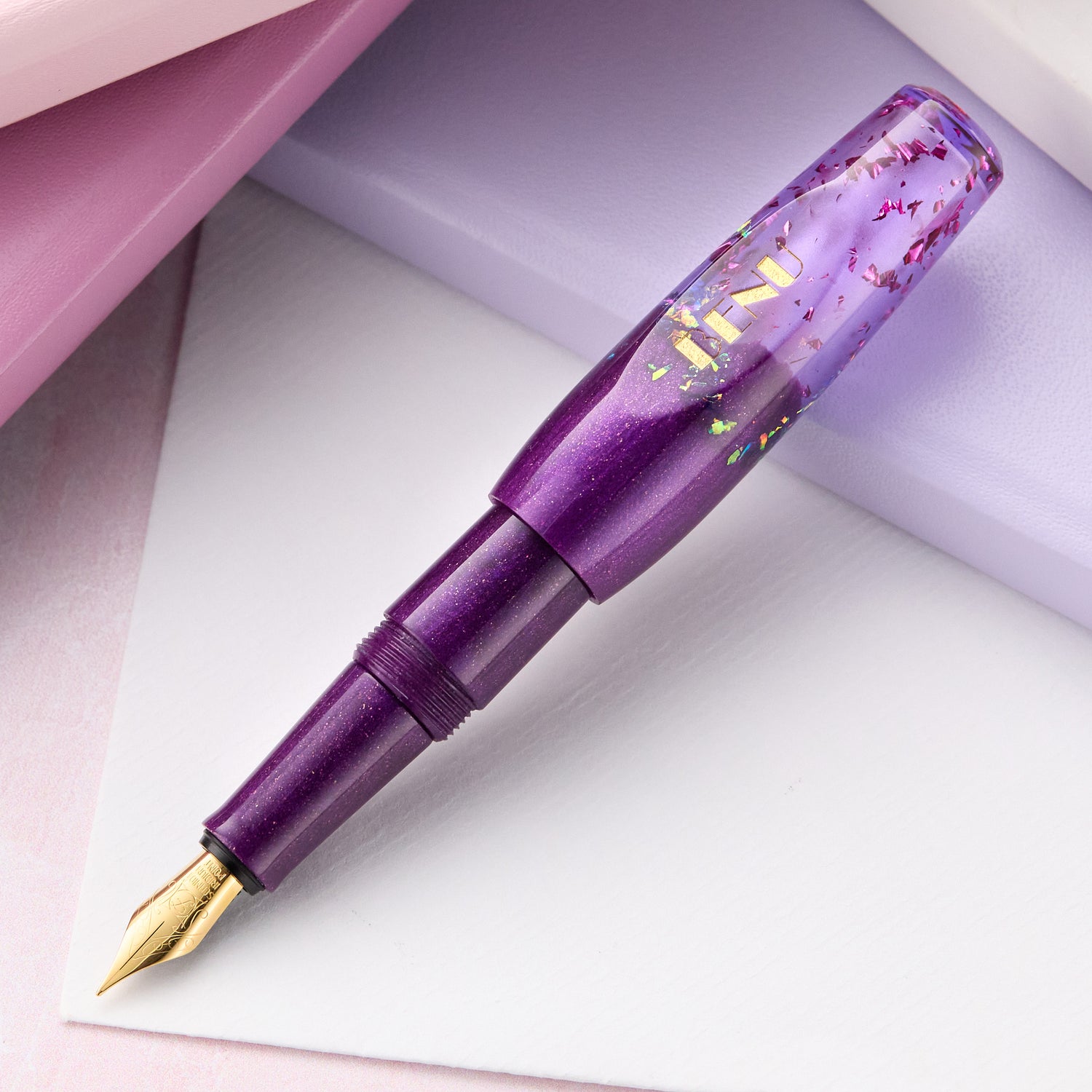 Magenta Madness introduces energetic shades of fuchsia, hot pink, and electric berry into the Pixie line. Each design combines saturated color with sparkling accents that fade into lighter, light- catching tones. The overall effect is bold, lively, and eye-catching. Each pen has a silver or gold Schmidt #5 stainless steel nib, and the clipless screw-cap pushes to post. Extensively tested before its launch, the Pixie strikes the balance between petite aesthetics and ergonomics, ensuring it is suitable for long writing sessions despite its compact size.