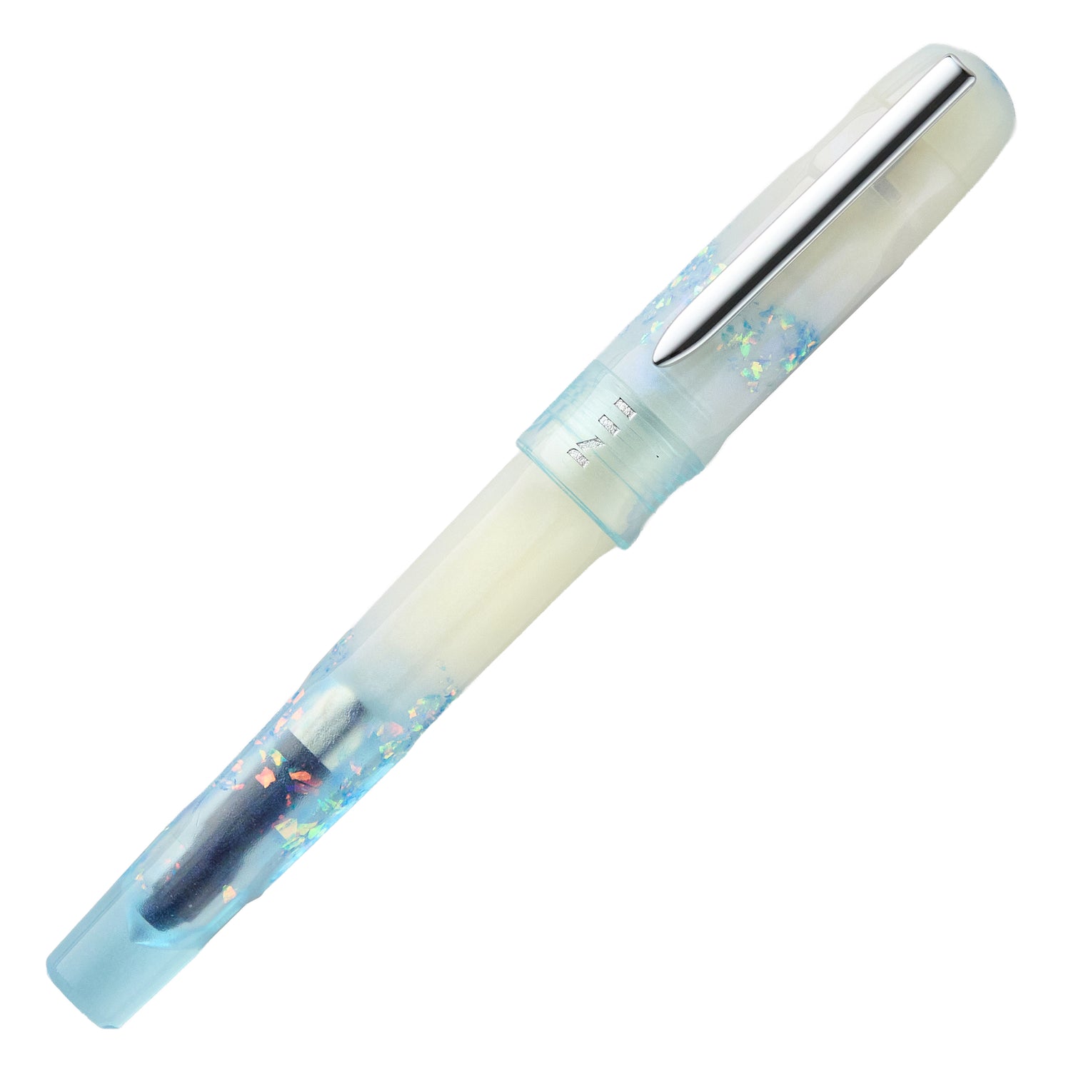 This BENU Talisman Moonstone is crafted from a creamy base with a pronounced pearlescent blue effect. It transitions into a transparent blue section infused with holographic sparkles. It has a silver Schmidt #6 stainless steel nib, a silver clip, and pushes to post. This new addition is a tribute to a good luck crystal.