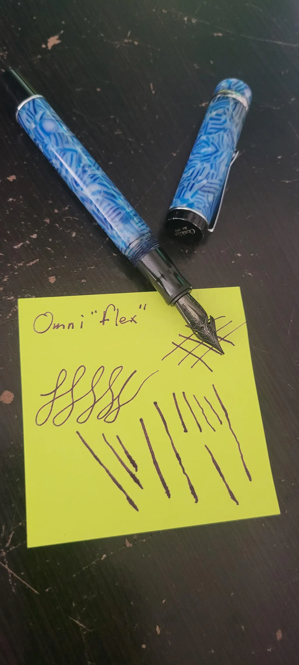 Our note about the JoWo Omniflex nib: This flex nib will allow you to experience more bounce and softness than writing with conventional nibs. You can achieve some line variation with a little additional downward pressure, to a point. We recommend flexing the nib to about twice the line width that you would see without using any pressure. Please take care to avoid pressing too hard on the nib, as over-flexing could prevent the tines from returning fully to their original position and decrease or stop your ink flow.