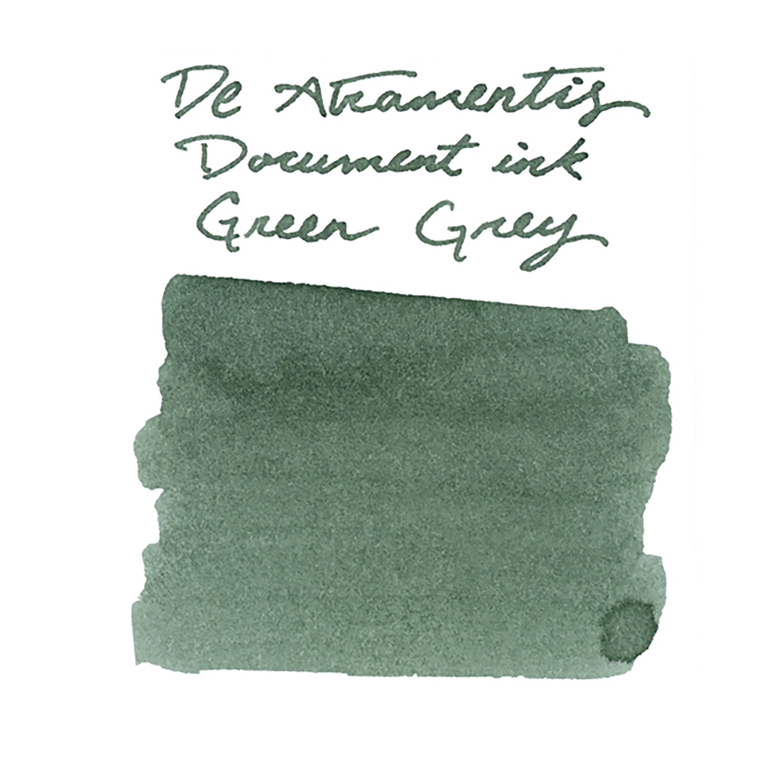 2ml sample of waterproof De Atramentis Document Ink Green Grey fountain pen ink, in a labeled plastic vial. This pigmented dark green ink is part of the Document series and is permanent and waterproof.