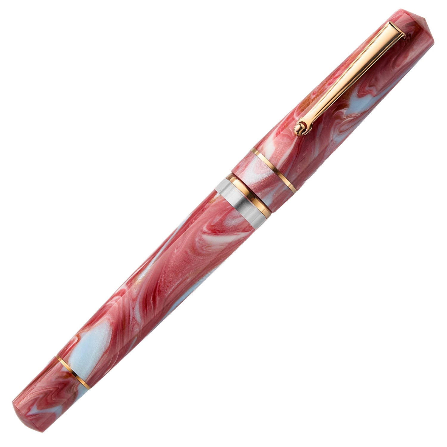 This pen is accented by rose gold trim and a matching nib. The stainless steel #6 fountain pen nib is made by the German brand JoWo. In addition to several standard nib sizes, there is also a flex nib variant that allows you to alter the line thickness by varying the pressure applied to the nib.