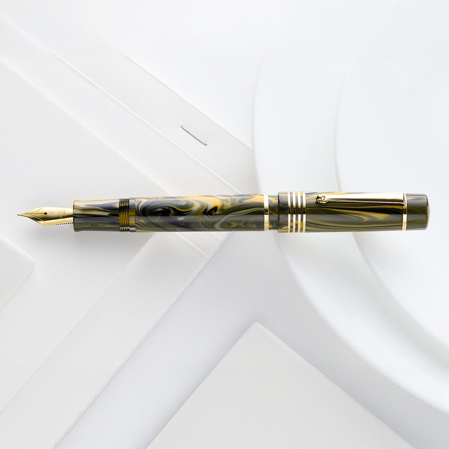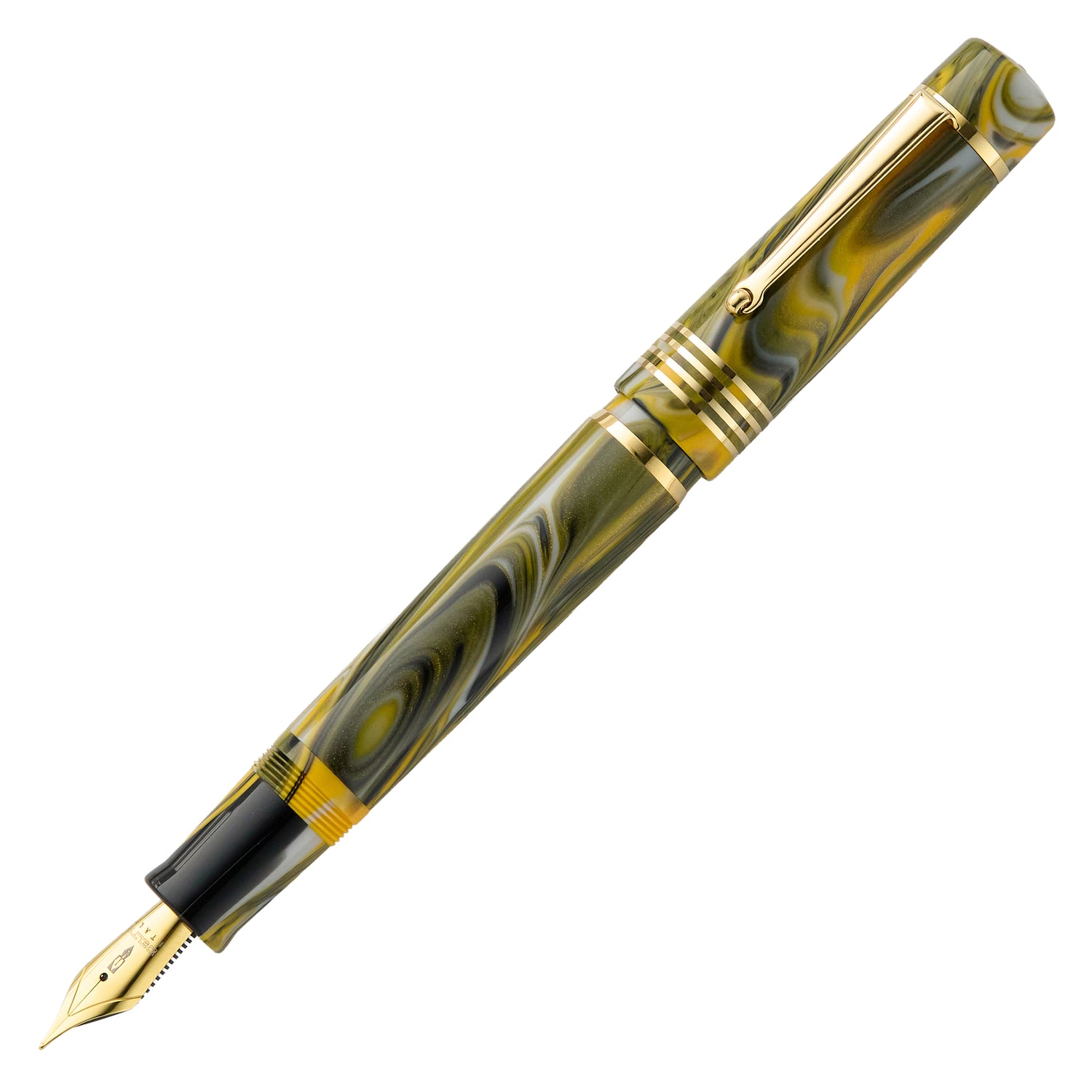 This Marigold green and yellow resin fountain pen is accented by gold trim and a matching nib. The stainless steel #6 fountain pen nib is made by the German brand JoWo. In addition to several standard nib sizes, there is also a flex nib variant that allows you to alter the line thickness by varying the pressure applied to the nib. It fills via cartridge (included) / converter, allowing you to use bottled ink.