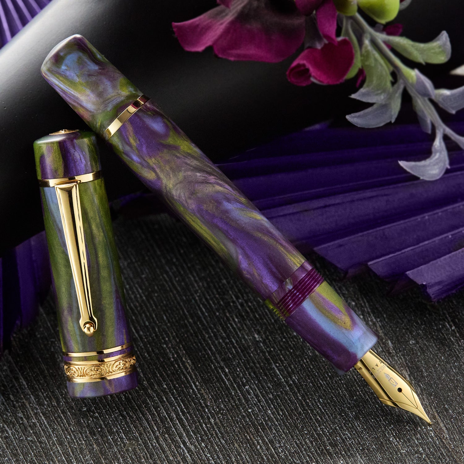 What truly defines this edition is its material. The Wisteria Walk resin is crafted by Jonathon Brooks, renowned for his richly layered, hand-poured materials made in the USA. Swirls of deep violet, fresh green, and luminous undertones move organically through the pen, evoking the feeling of a blooming wisteria path in motion. Each piece carries subtle variations, making every pen uniquely expressive.