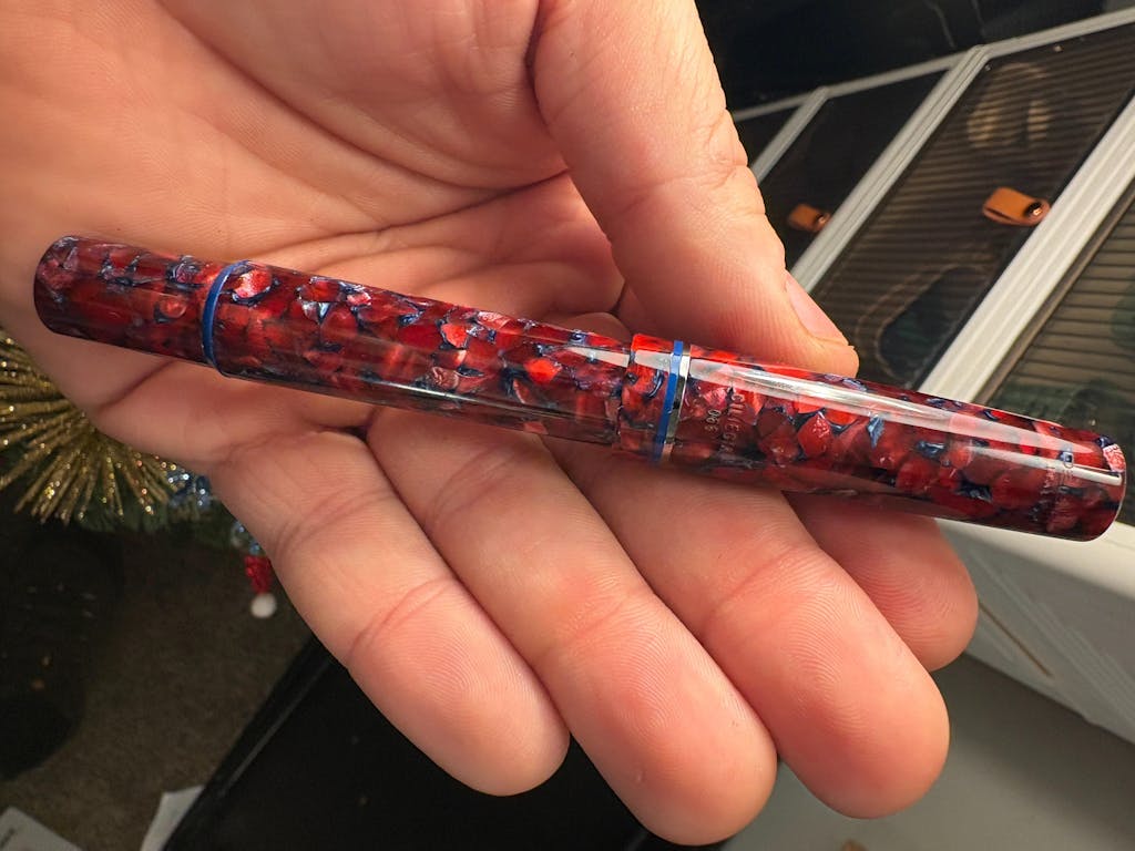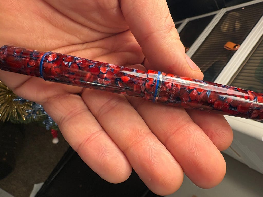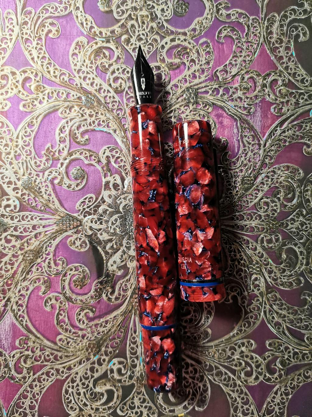 This Delta Spaccanapoli fountain pen was hand turned from a single bar of flecked burgundy red resin, that also has blue throughout. Ciliegia is Italian for "cherry". It features a gunmetal clip with a roller, and elegant trim rings with a subtle blue accent. This color is a Goulet Pens exclusive, limited run!
