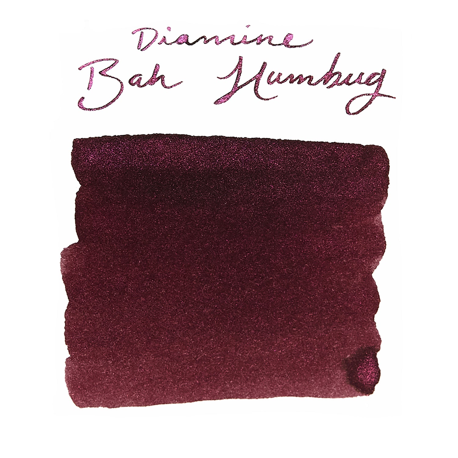 Initially launched as part of the 2023 Diamine InkVent calendar and now a part of the regular Diamine Purple Edition collection, this Bah Humbug color is a dark red, and it's a chameleon color, meaning it can appear to change color depending on the angle and lighting it's viewed in.