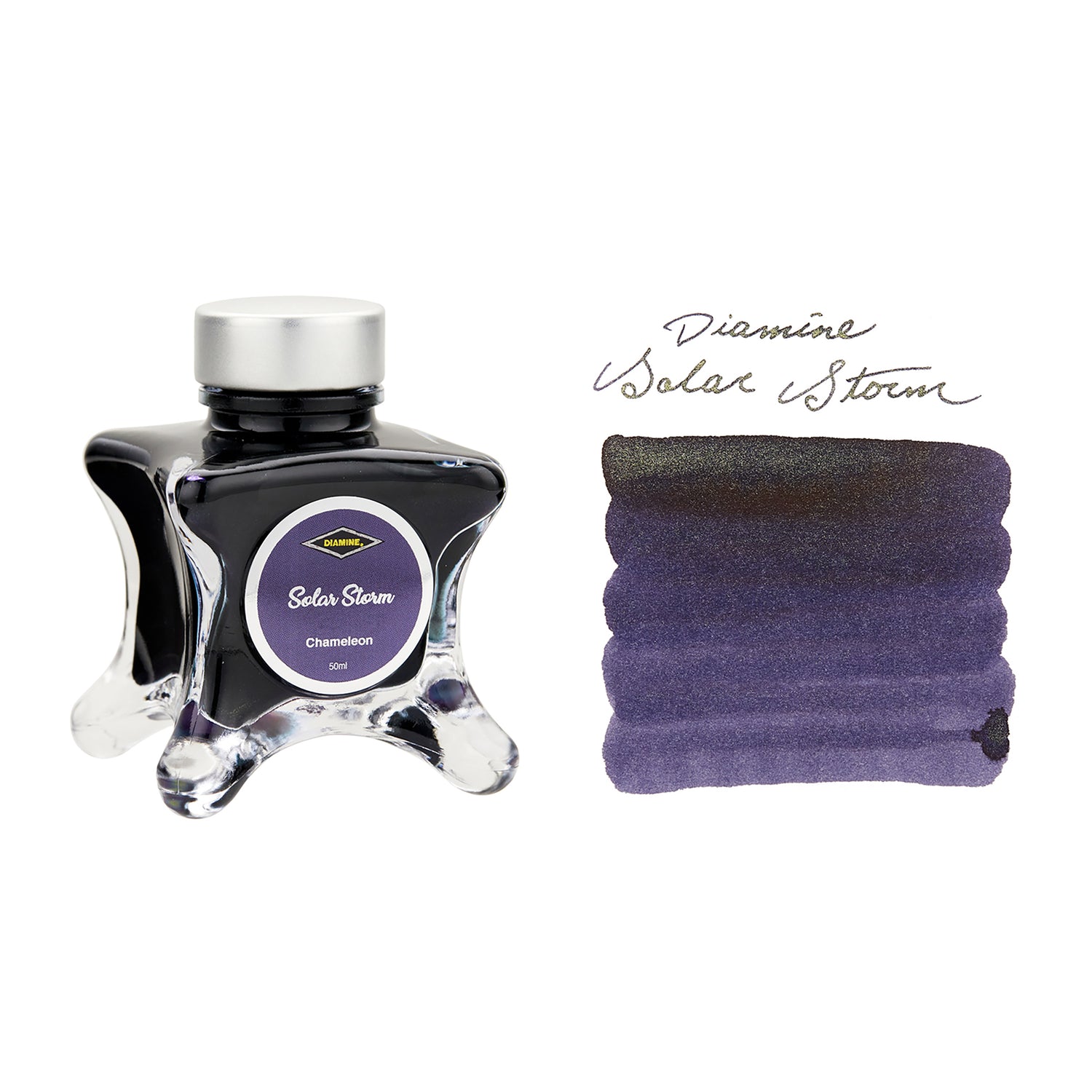 This 50ml glass bottle of Diamine Solar Storm fountain pen ink was initially launched as part of the 2022 Diamine InkVent calendar, and is now a part of the regular Diamine Green Edition collection. This sheening purple ink features added shimmer.