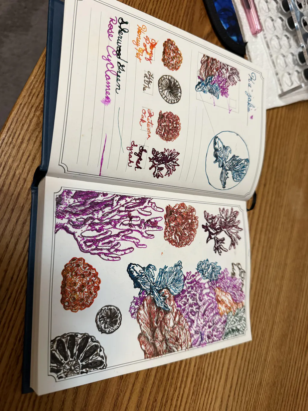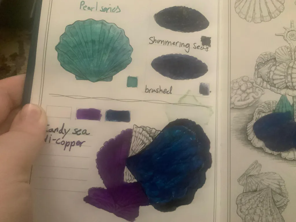 There are 288 pages with different configurations including ocean-themed illustrations to color in, ink indexing pages, and completely blank pages. You can either draw on them directly with your fountain pen or use a swab or brush to apply fountain pen ink in a wash. The book includes: