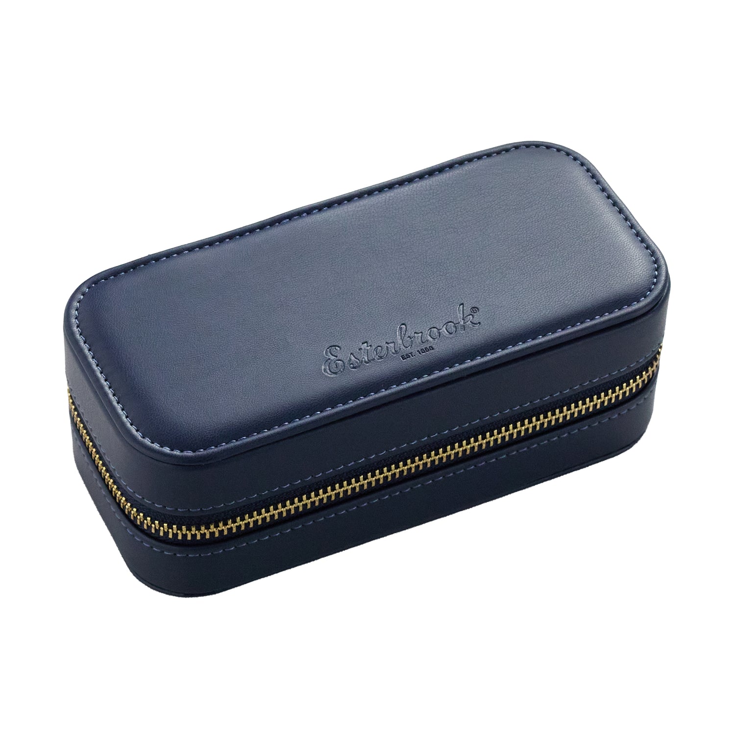 This blue synthetic leather case holds up to 6 pens, each held snug in its own fabric-covered slot. The zipper helps to keep the pens secure.