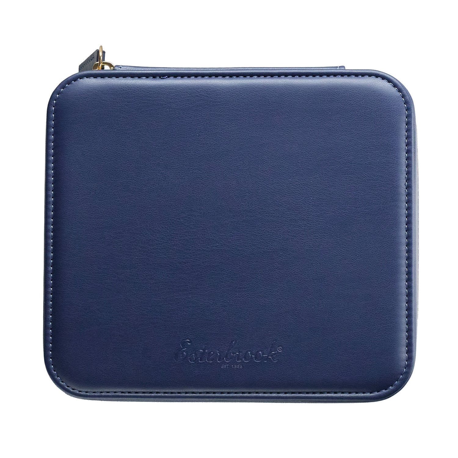 This blue synthetic leather case holds up to 12 pens, each held snug in its own fabric-covered slot. The zipper helps keep the pens secure.