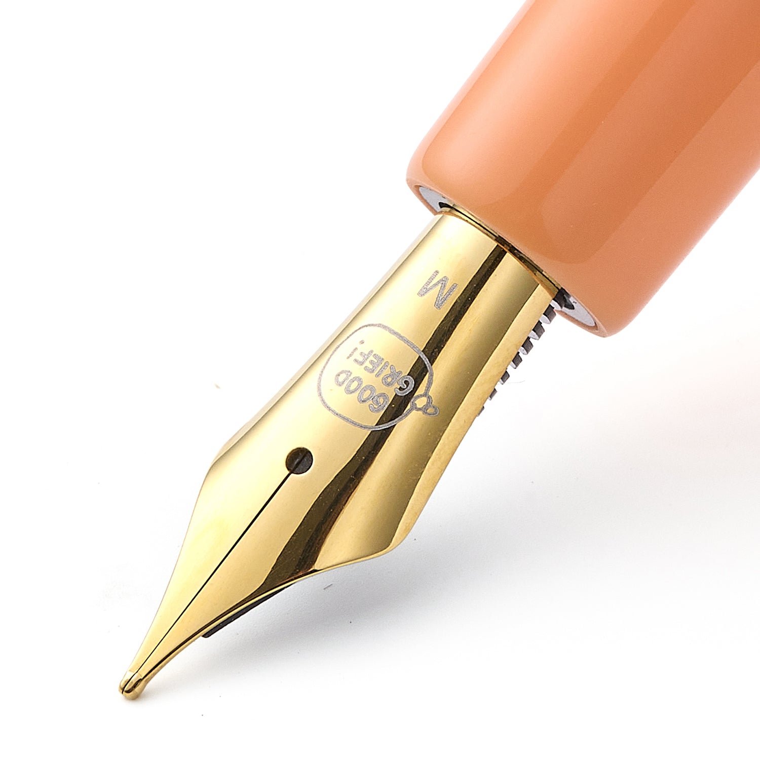 This Esterbrook X Peanuts 75th Anniversary Edition Fountain Pen - Sally is a special edition pink and orange pen that comes with a #6 JoWo German gold-plated steel nib, engraved with "Good Grief!" on the nib.