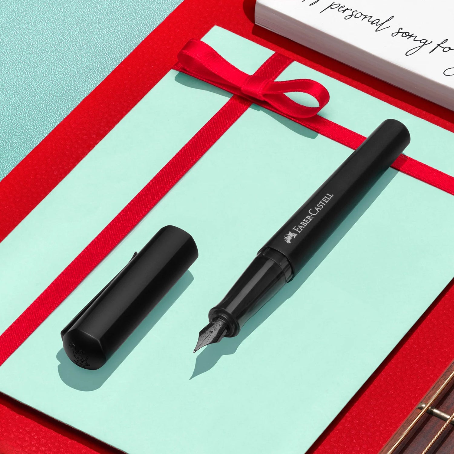 Iconic Faber-Castell Jousting Knights are embossed and prominently displayed on the top of the detachable cap. The cap features a stable lacquered metal clip in black. It easily pulls off and posts on the back end of the pen while writing if desired. The pen has a balanced weight with and without the cap.