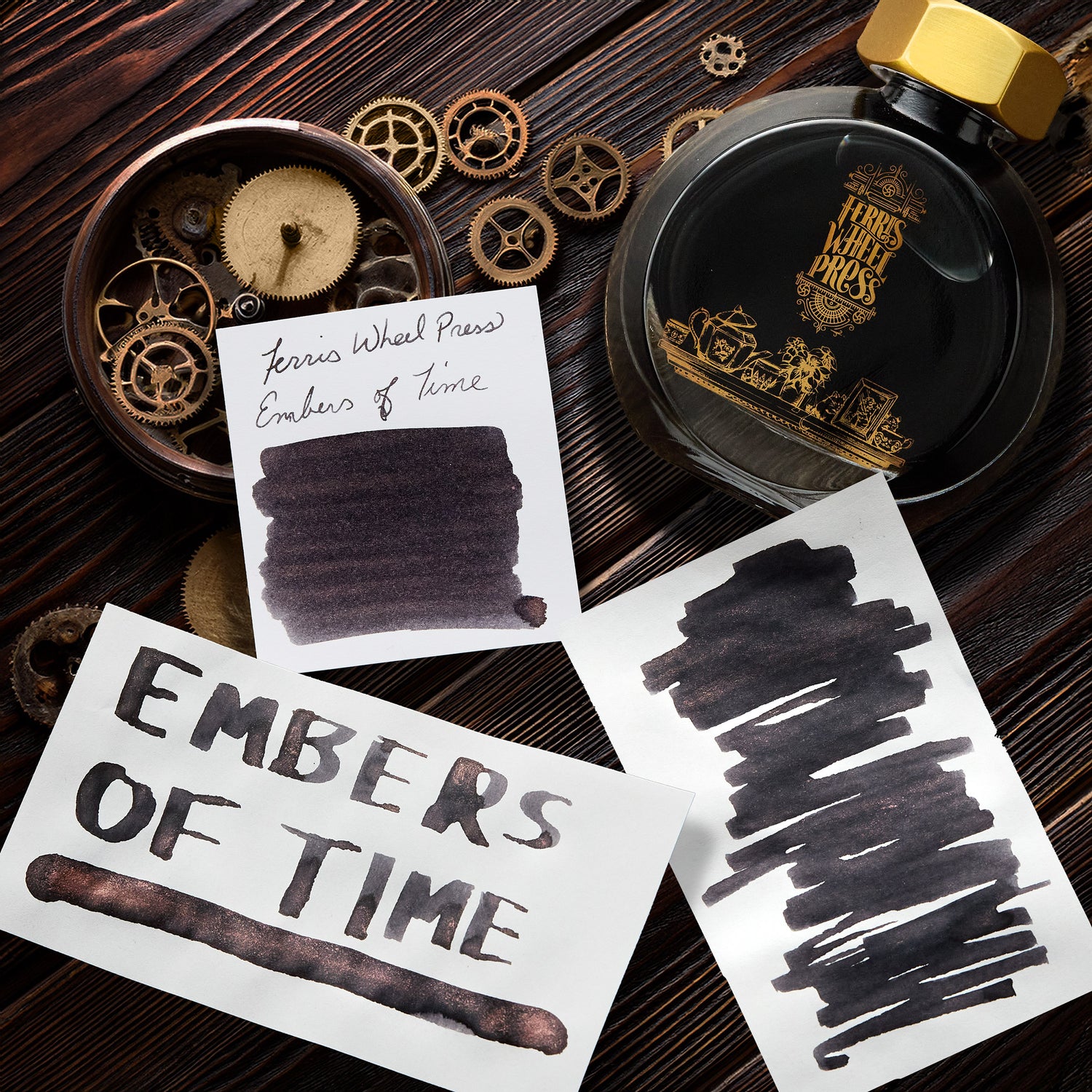 2ml sample of Ferris Wheel Press Embers of Time fountain pen ink, a shaded dark grey ink with rose gold shimmer.