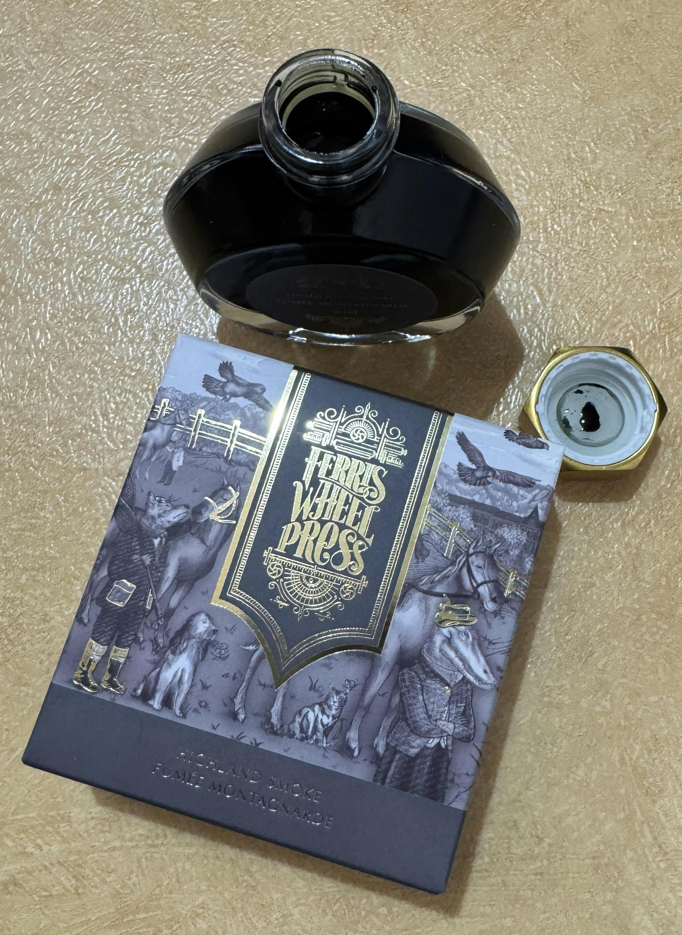 38ml glass bottle of Ferris Wheel Press Highland Smoke fountain pen ink, a great everyday dark gray ink.