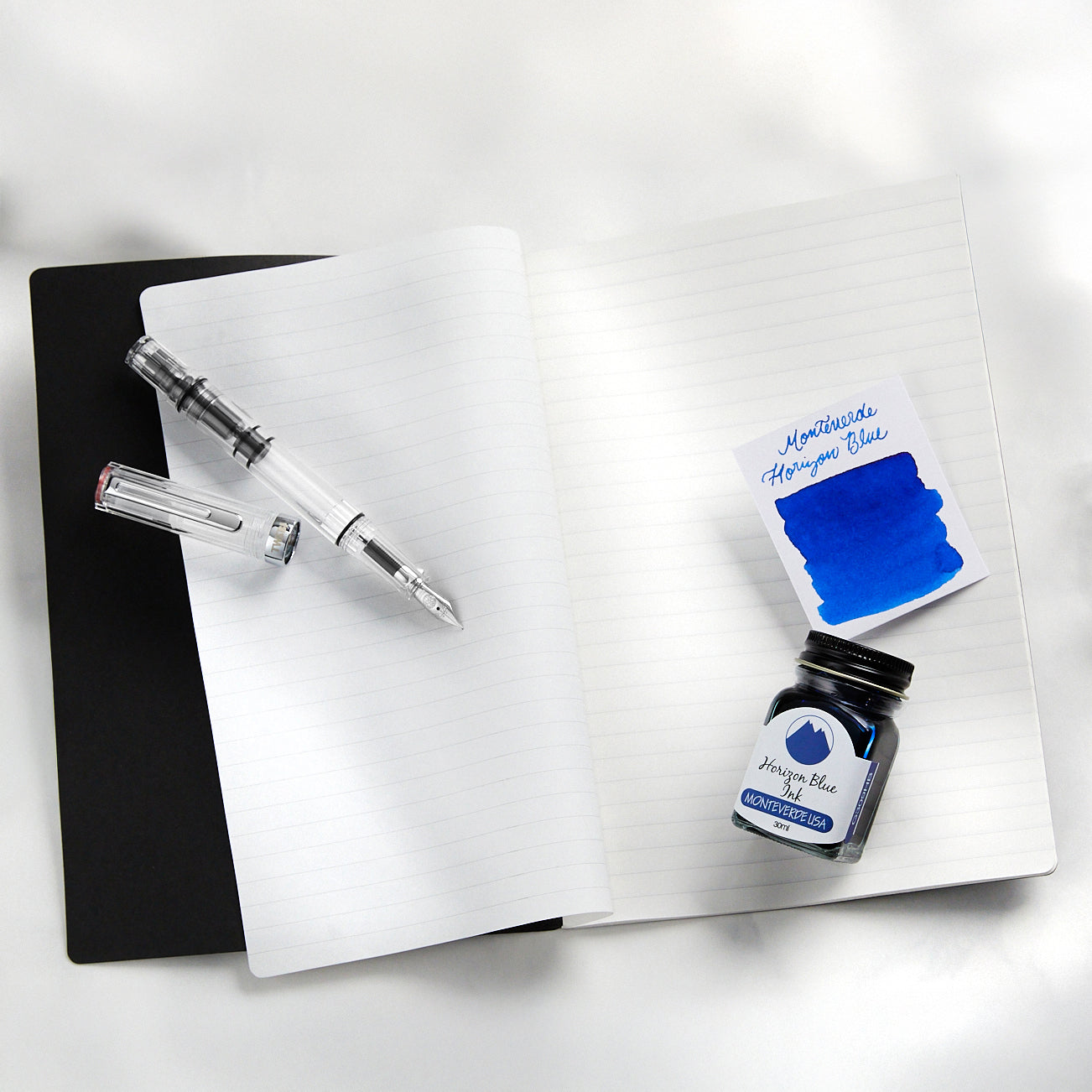 We've put together this affordable set to dive into the world of fountain pens. This bundle comes with a clear TWSBI ECO fountain pen that uses bottled ink; a 30ml glass bottle of Monteverde Horizon Blue ink; and an A5-sized Goulet notebook with dot grid Tomoe River 68gsm paper.