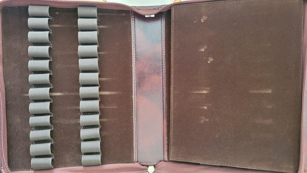 This burgundy leather Girologio zippered pen case has a soft velvet interior and holds up to 24 pens. Made from high quality, ecologically tanned leather, Girologio pen cases are an excellent choice for protecting your writing instruments. These leather cases are soft and supple while simultaneously being tough and durable.