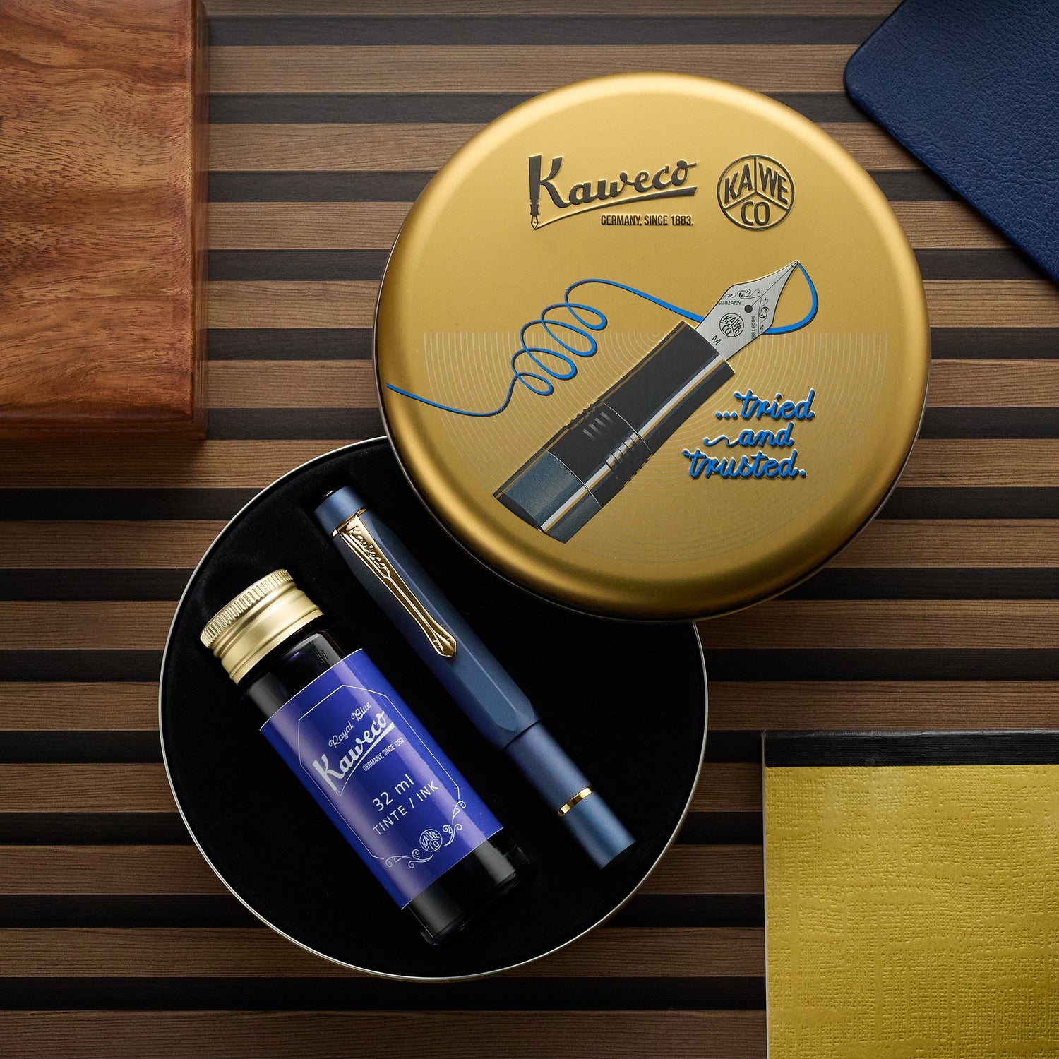 The Starter Set comes with the pen and a 32ml bottle of Royal Blue bottled ink, set in a round tin. Replacement nib units are available separately (note- these nib units are a different size than the normal Kaweco Sport).