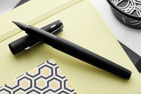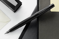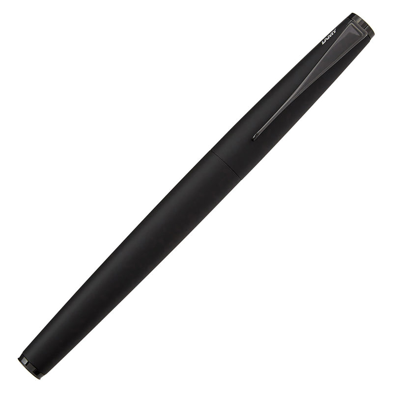 This stealthed-out LAMY studio fountain pen has a matte black lacquer finish. It has a propeller shaped black metal clip and an interchangeable black Lx steel nib. This fountain pen comes with a blue LAMY ink cartridge and a Z27 converter for use with bottled ink so you can get started writing right away.