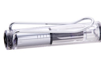 This clear demonstrator LAMY vista fountain pen, essentially the clear version of the LAMY safari, has silver trim and an interchangeable silver steel nib. It features a triangular grip for proper hand position when writing. It comes with a blue LAMY ink cartridge to get you started writing right away.