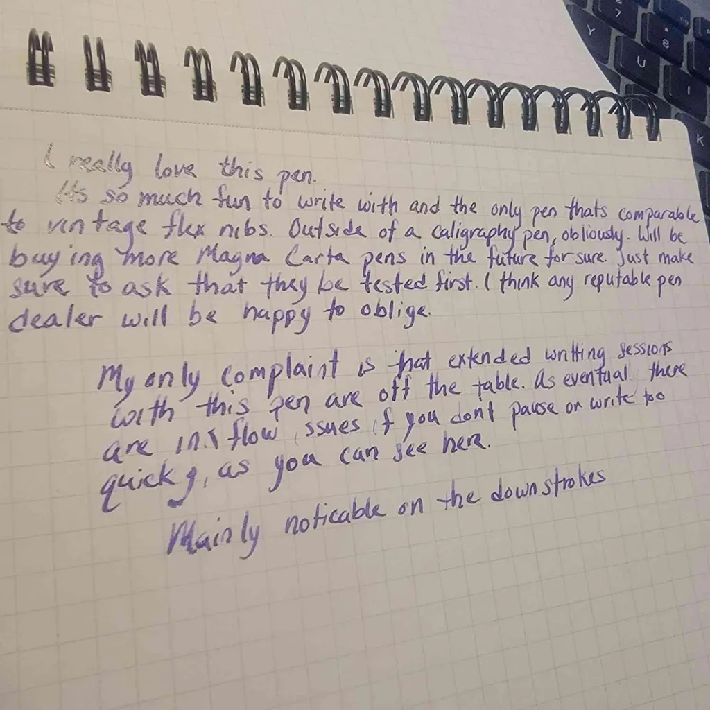The compact Magna Carta Mag 500 fountain pen is smaller than its Mag 600 sibling, with a #5 Magna Carta 14K True Flex Nib and an ebonite feed housing. A unique and desirable flex nib that effortlessly transitions between intricate detail and wide strokes.