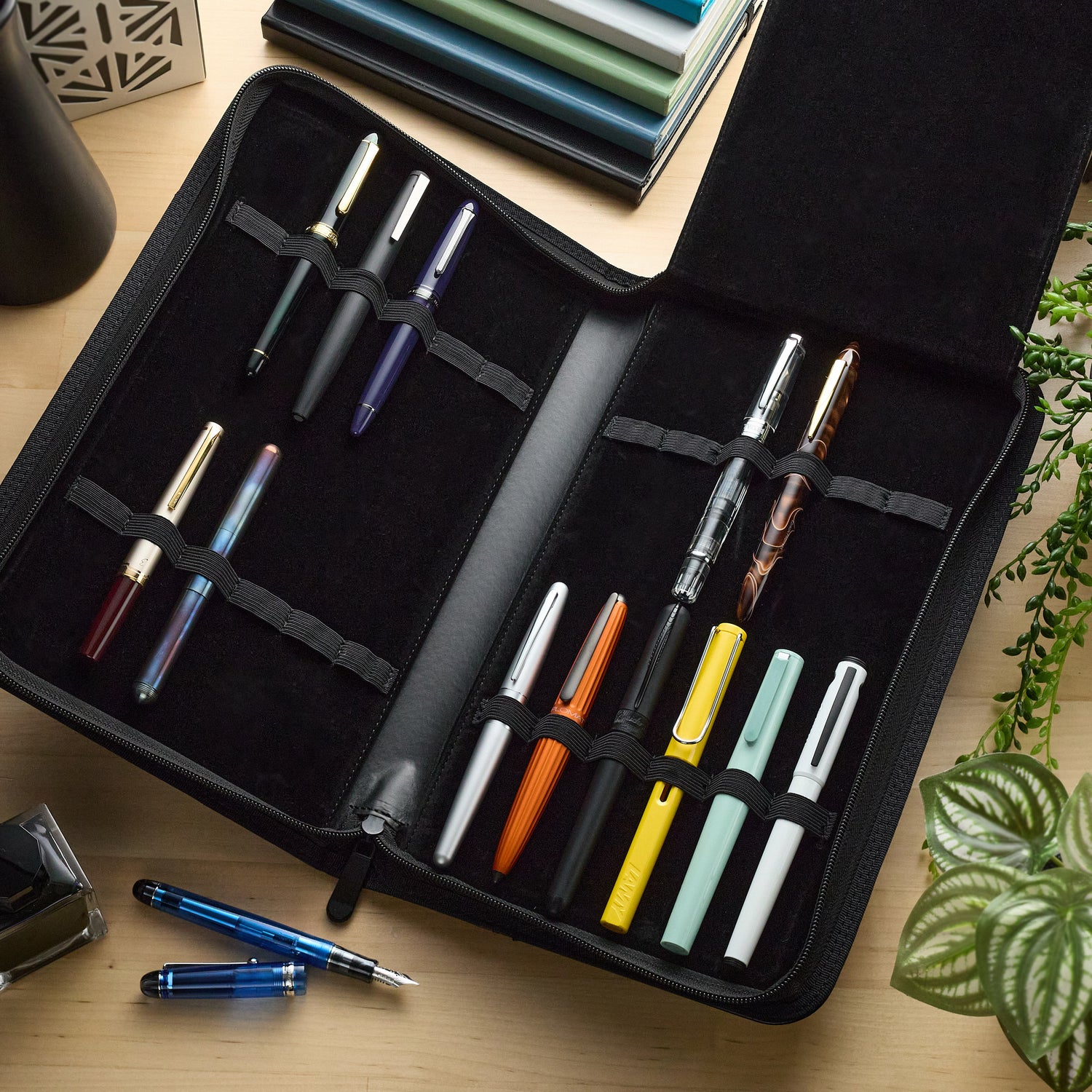 Crafted with premium vegan leather, this green and black Monteverde USA deluxe zipper case offers secure, stylish storage for your pen collection. With a 24 pen capacity, it features a soft interior lining, individual slots for protection, a divider between the two sides, and a smooth zipper closure. Perfect for collectors on the go, or for elegant desktop display.
