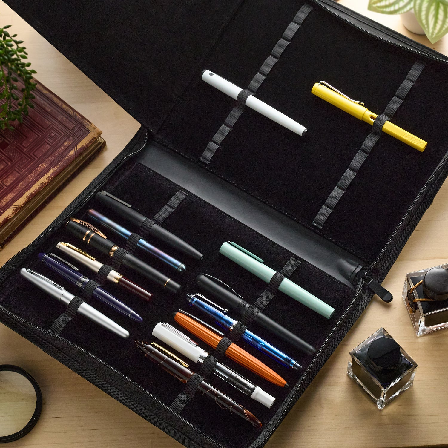 Crafted with premium vegan leather, this green and black Monteverde USA deluxe zipper case offers secure, stylish storage for your pen collection. With a 36 pen capacity, it features a soft interior lining, individual slots for protection, a divider between the two sides, and a smooth zipper closure. Perfect for collectors on the go, or for elegant desktop display.