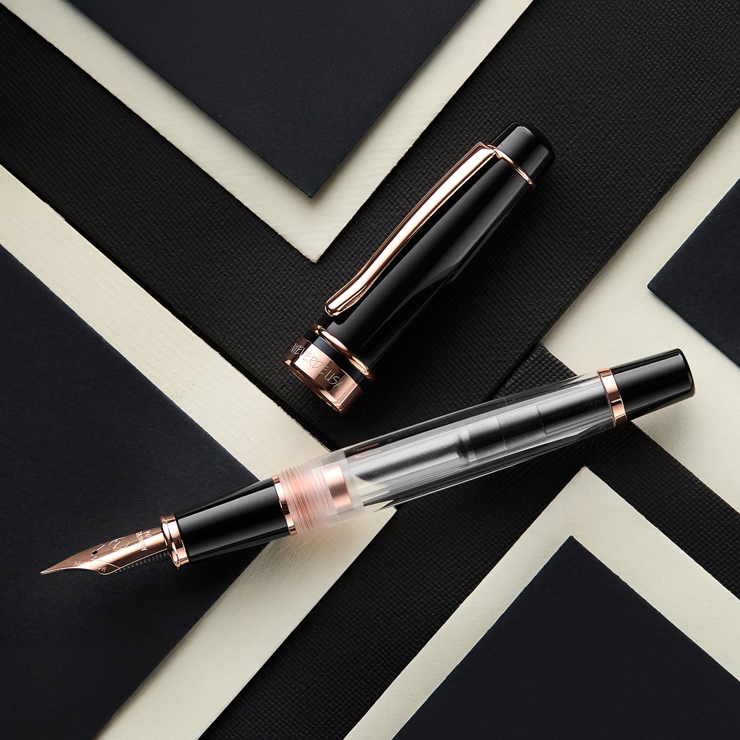 This Prima Piston fountain pen features a clear ink barrel so you can see your ink and the piston mechanism at work, complemented by a solid black resin cap. It is completed with rose-gold plated trim and a matching nib.