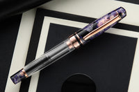 This Prima Piston fountain pen features a clear ink barrel so you can see your ink and the piston mechanism at work, complemented by a semi-translucent purple marbled resin cap. It is completed with rose-gold plated trim and a matching nib.