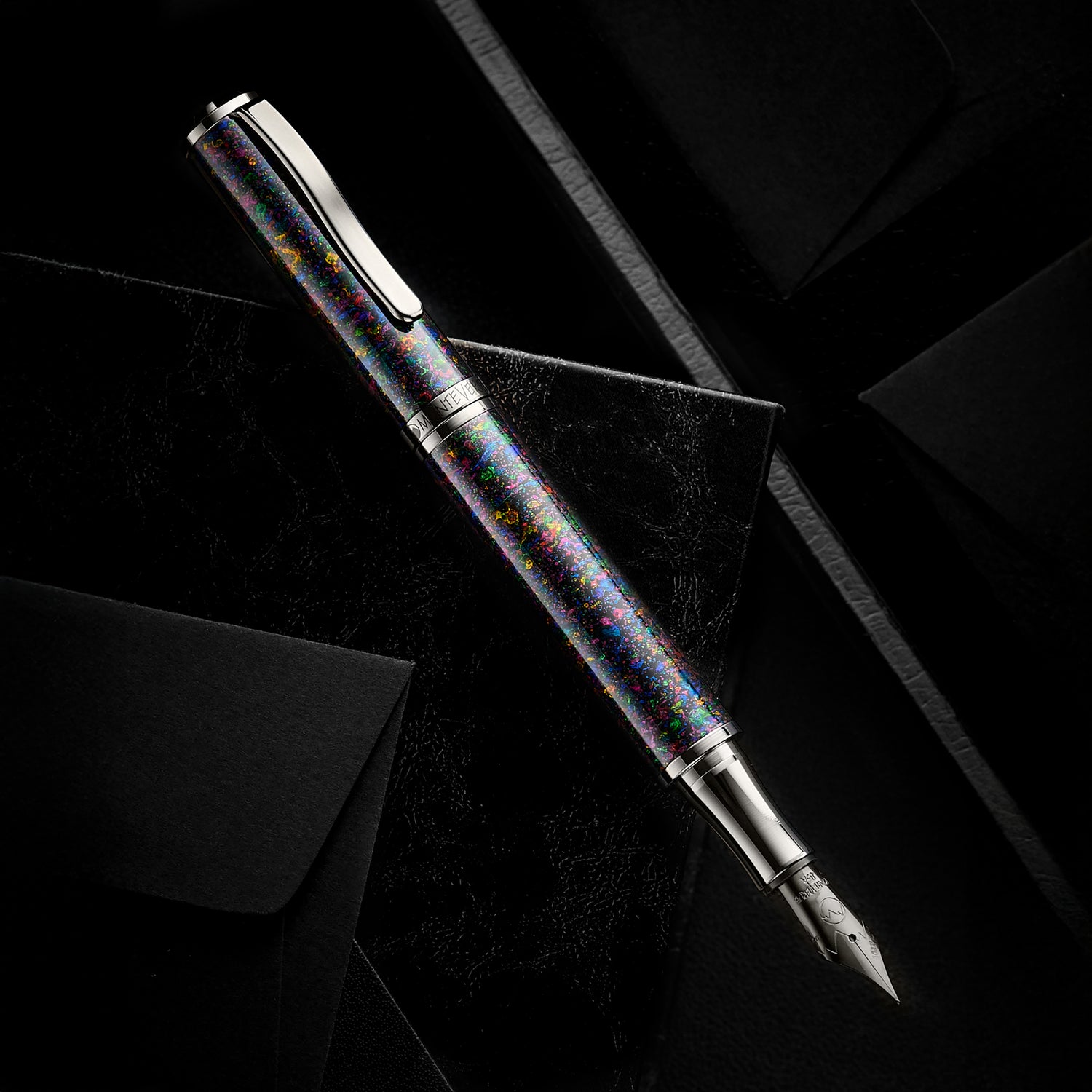 This special edition Goulet-exclusive, brings many fun colors to life in a new fountain pen! The Regatta Vega has a black base with heavy lacquer coating and blue, pink, green and yellow spatters. It is accent with gunmetal trim and a black nib.