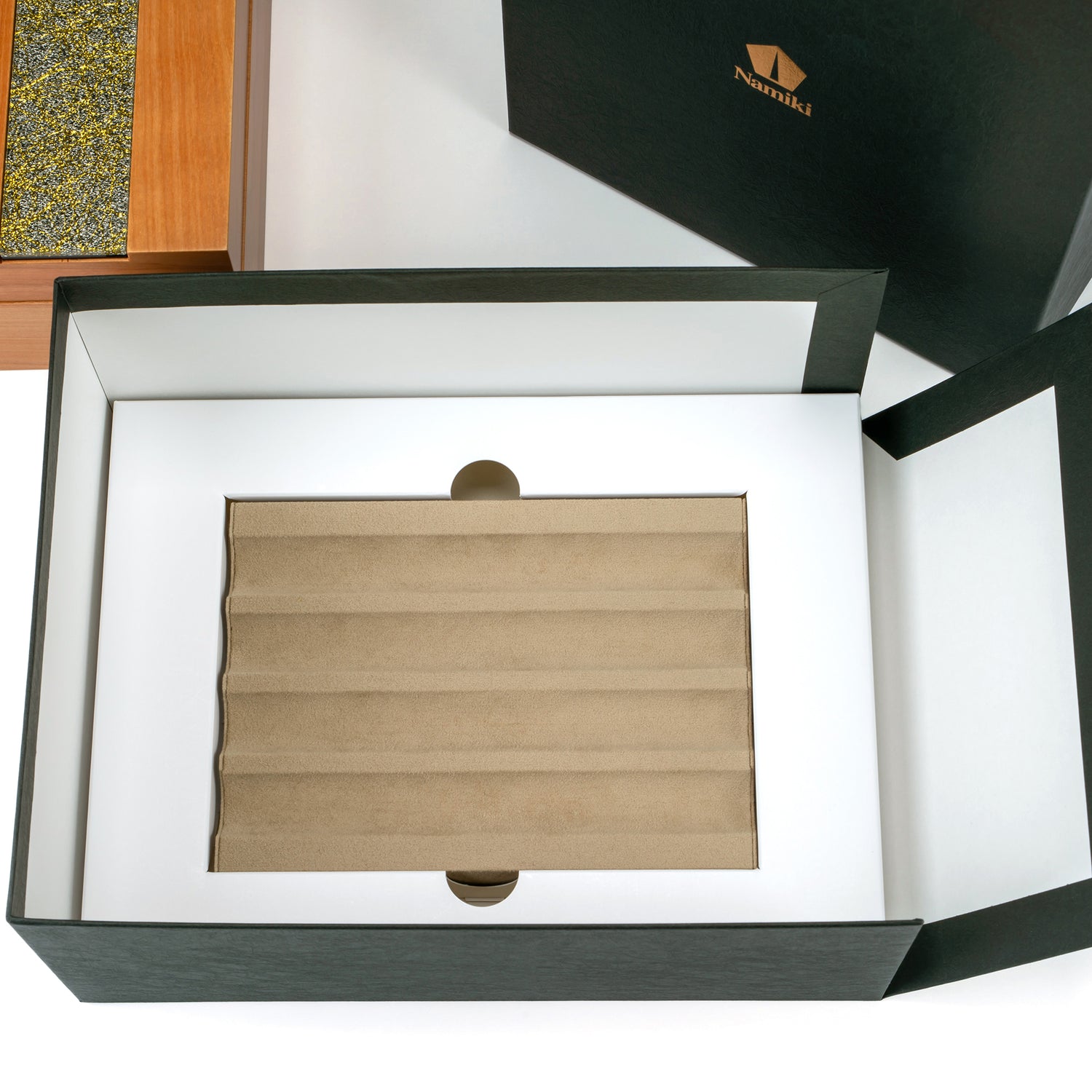texture of quail eggshell; and Togidashi Maki-e, where layers of lacquer and sprinkled powders are polished back to reveal a luminous, unified surface. Together, these methods create depth, brilliance, and harmony across the full composition.