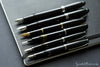 The Noodler's Ahab flex pen features a steel flexible #6 nib and a slide piston mechanism. If you'd like, you can even remove the piston mechanism and use the pen as an eyedropper for a massive 6ml ink capacity. This solid black Ahab is made of a celluloid derivative and is technically biodegradable and formed from a "renewable resource". The vegetal resin body of this pen may show particles or striations within the material. This is most noticeable in demonstrators and bright colors.
