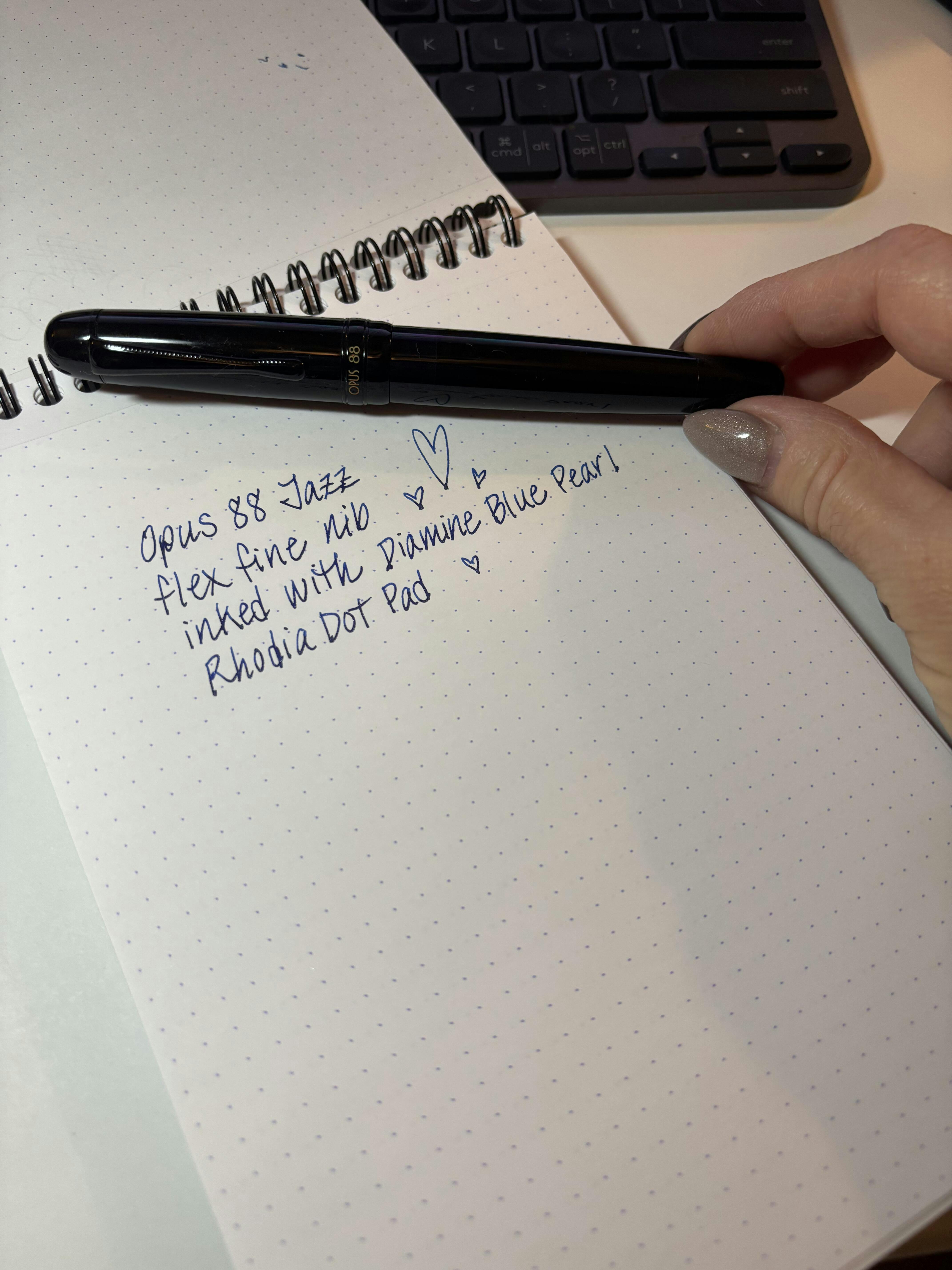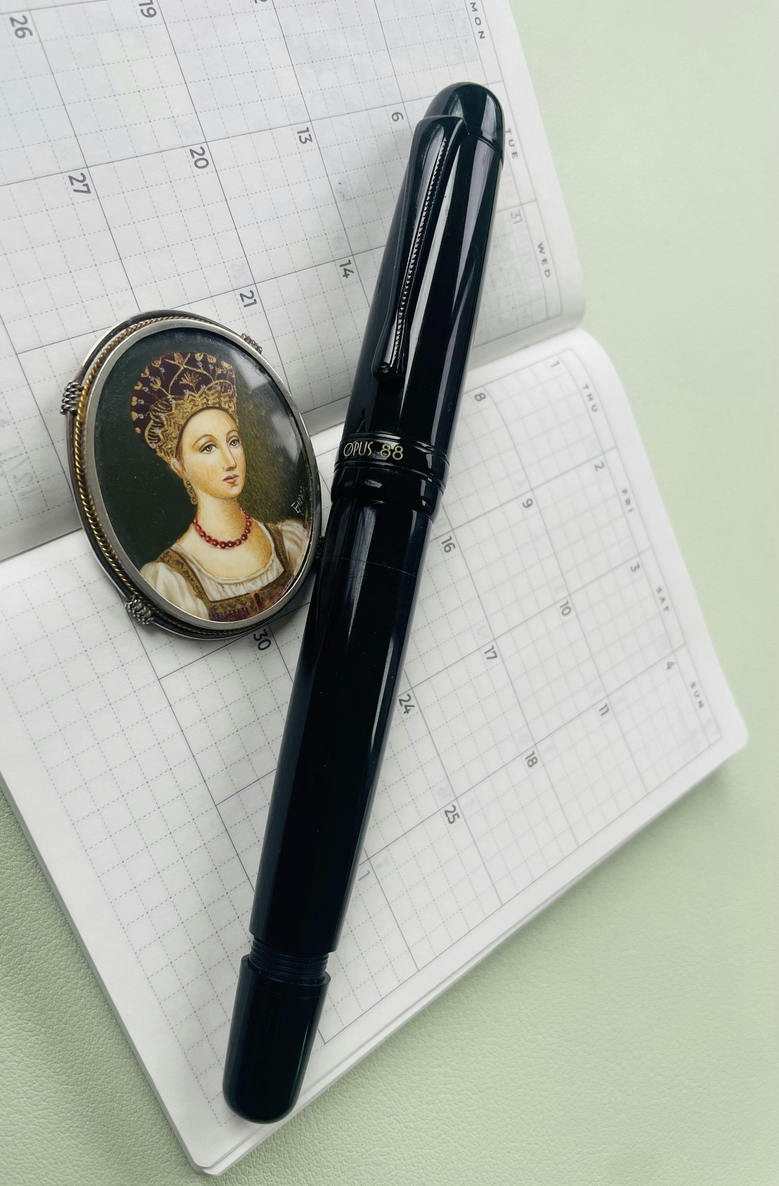 This Opus 88 Jazz fountain pen in Solid Black has a black barrel and cap, and is accented by black hardware. This large postable pen is an eyedropper-filled fountain pen with a piston operated shut-off valve. It has a silver stainless steel #6 JoWo nib and includes a glass eyedropper to fill the pen with your favorite ink.