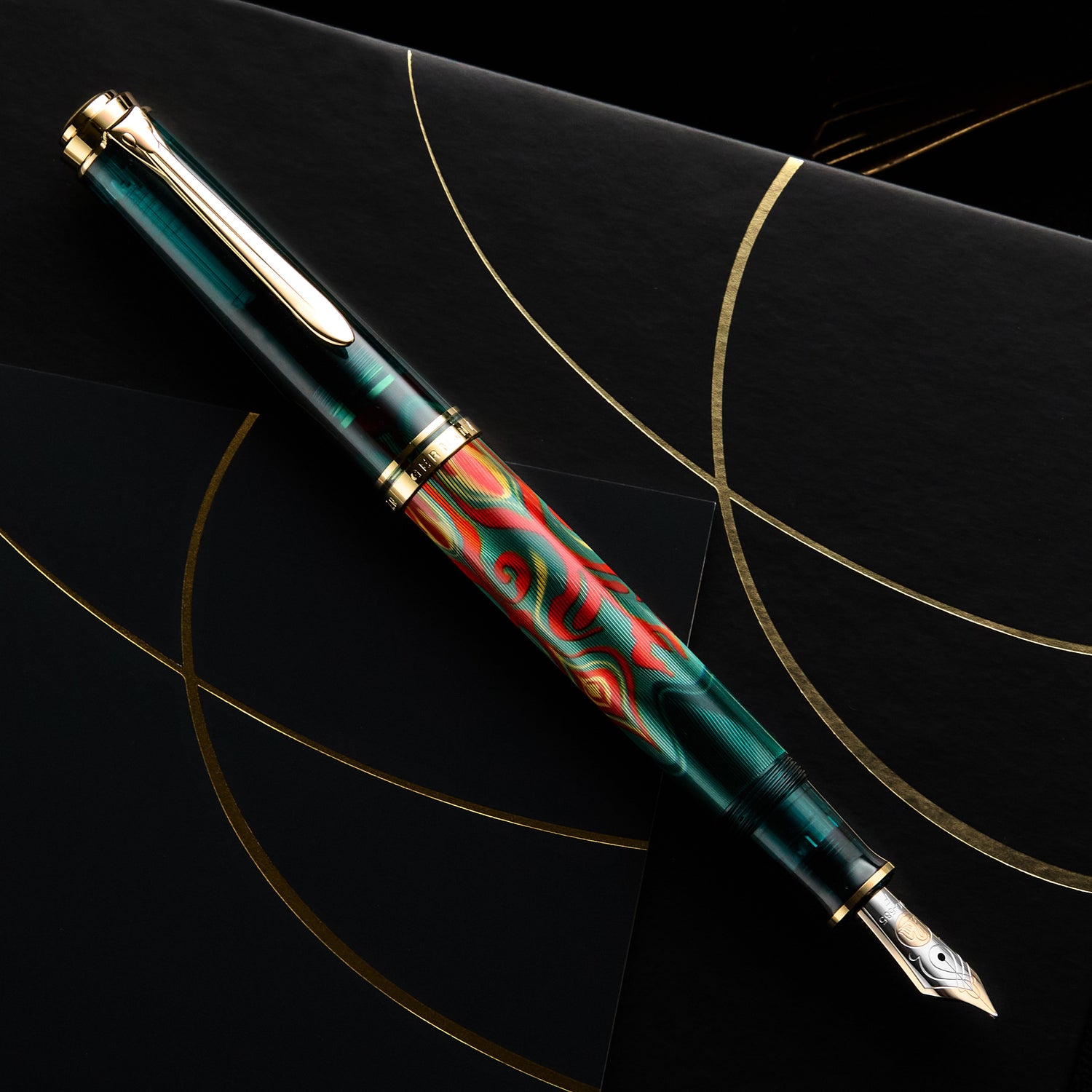 The Special Edition Pelikan Souverän® M601 captivates with an unmistakable design which makes it a coveted work of art. The cap, forepart, and knob of this extraordinary piston-fill fountain pen are made of a premium, self-polishing resin. The two-tone 14-karat gold nib glides across paper effortlessly, offering soft and powerful written expression. The golden decorative elements on the fountain pen, such as the iconic twin rings and quintessential Pelikan beak clip, are plated with 24-karat gold to emphasize the pen’s elegance and refinement.