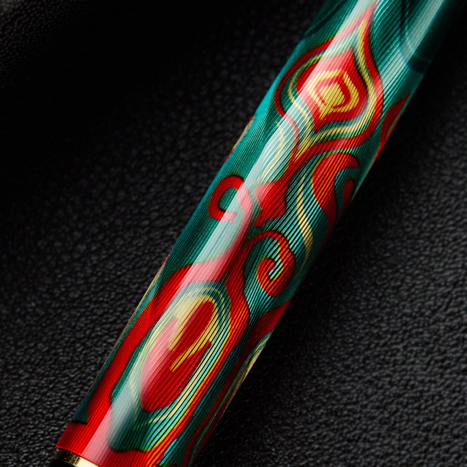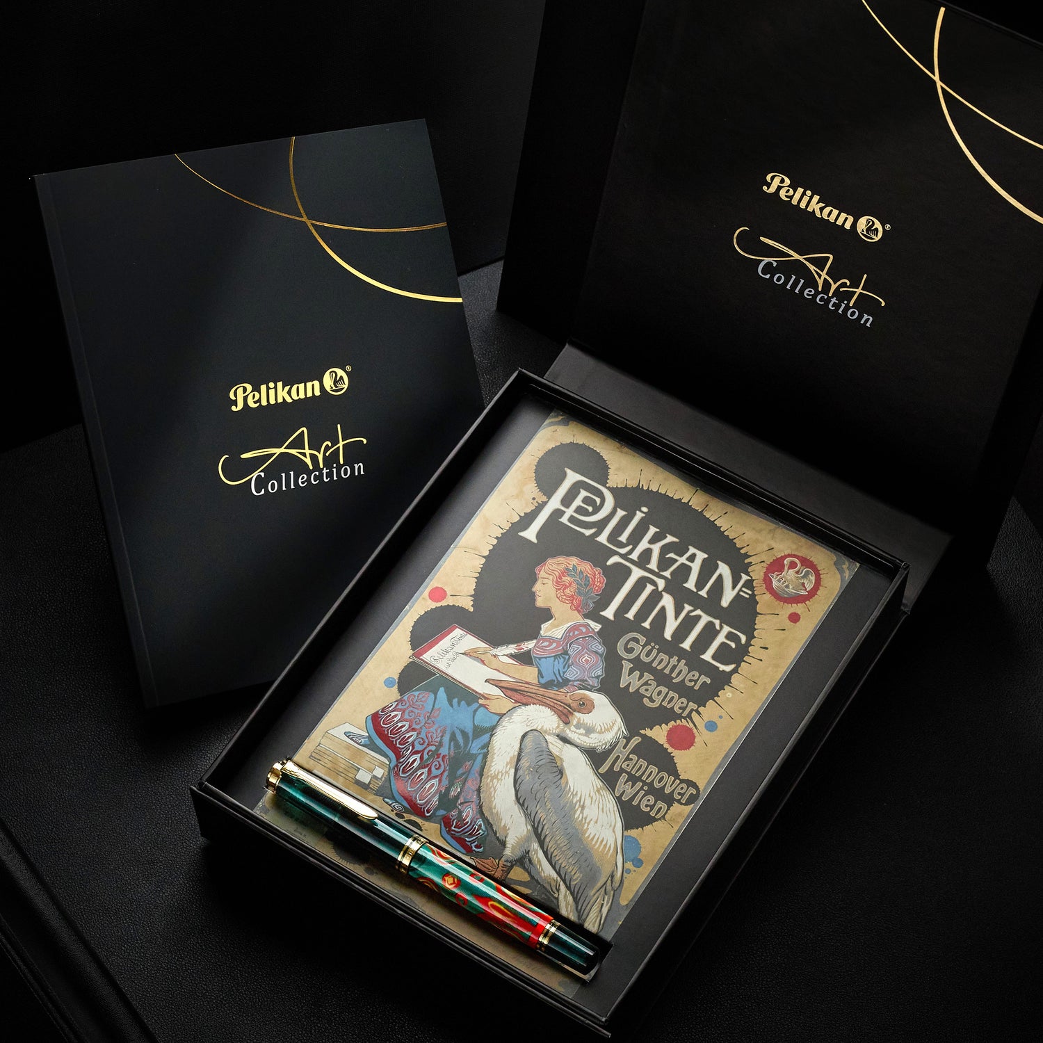 Rudi Rother (1863-1909) was a German painter and illustrator. In 1903, he won the coveted annual Pelikan art competition. This was one of Rother’s most significant works which he designed for Pelikan. The woman writing a document next to a pelican depicts a combination of functionalism and aesthetics that is typical of Jugendstil (Germany’s art nouveau movement). Rother’s talent at effectively connecting graphic design and fine art shaped the style of commercial art at the turn of the century. His humorous pen-and-ink illustrations garnered respect particularly in the world of advertising having a decisive influence on commercial art. His work was characterized by flowing lines, ornamental designs, and stylized figures. The pen based off of his design, features an interesting shade of green resin for the section, piston knob, and cap. The barrel takes its inspiration from the pattern in the woman’s dress.
