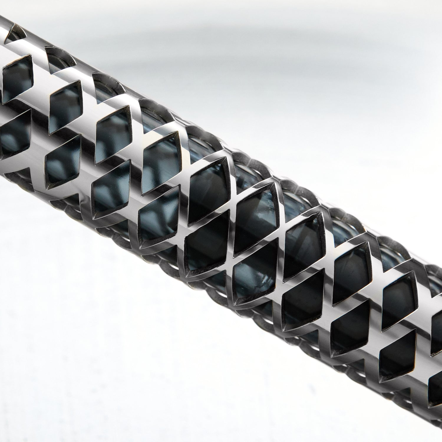 The metal sleeve, precisely cut with a geometric pattern and carefully placed onto the barrel like a jewel, creates a captivating contrast of surfaces and textures. This intricate overlay adds a unique tactile dimension while giving the pen an unmistakably modern and industrial character — bold, architectural, and striking in its precision.