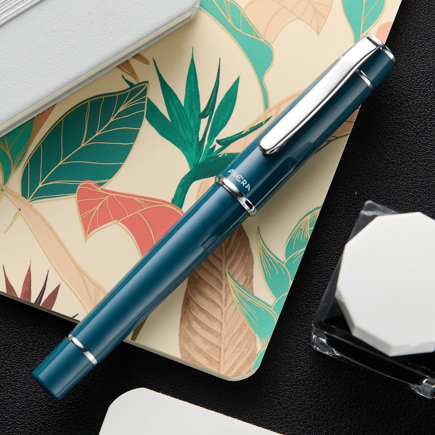 The petite Pilot Prera has a clean and simple look. This fountain pen has a vibrant, opaque acrylic teal body with silver accents. This hue is inspired by the cozy, nostalgic ambiance of traditional Japanese coffee houses, which evoke warmth, charm, and quiet sophistication.