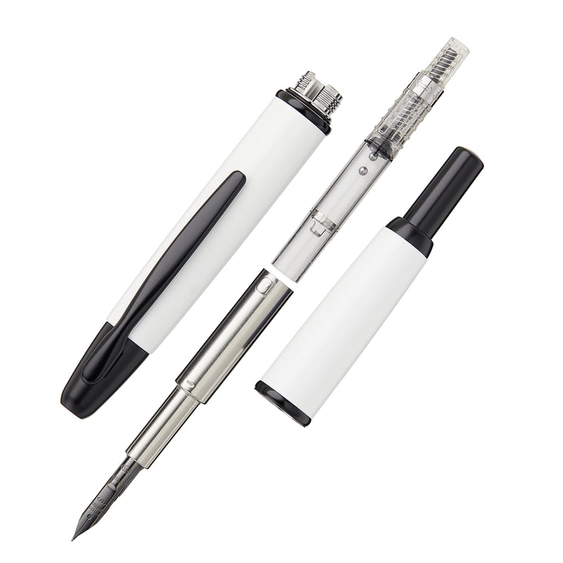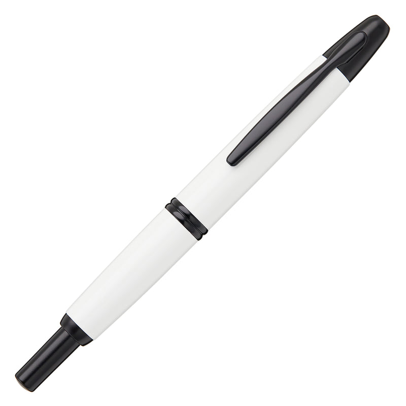 This modern Pilot Vanishing Point fountain pen has a shiny white barrel with black accents. This fountain pen comes with a retractable black ionized 18k gold nib - just click to expose or retract the nib. A hidden trap door helps keep the nib from drying out when not in use. A Pilot CON-40 converter is included with this pen, as well as a Pilot ink cartridge. A metal cartridge cap is also included for use with the ink cartridge. Each Vanishing Point fountain pen is beautifully merchandised in a black gift box.