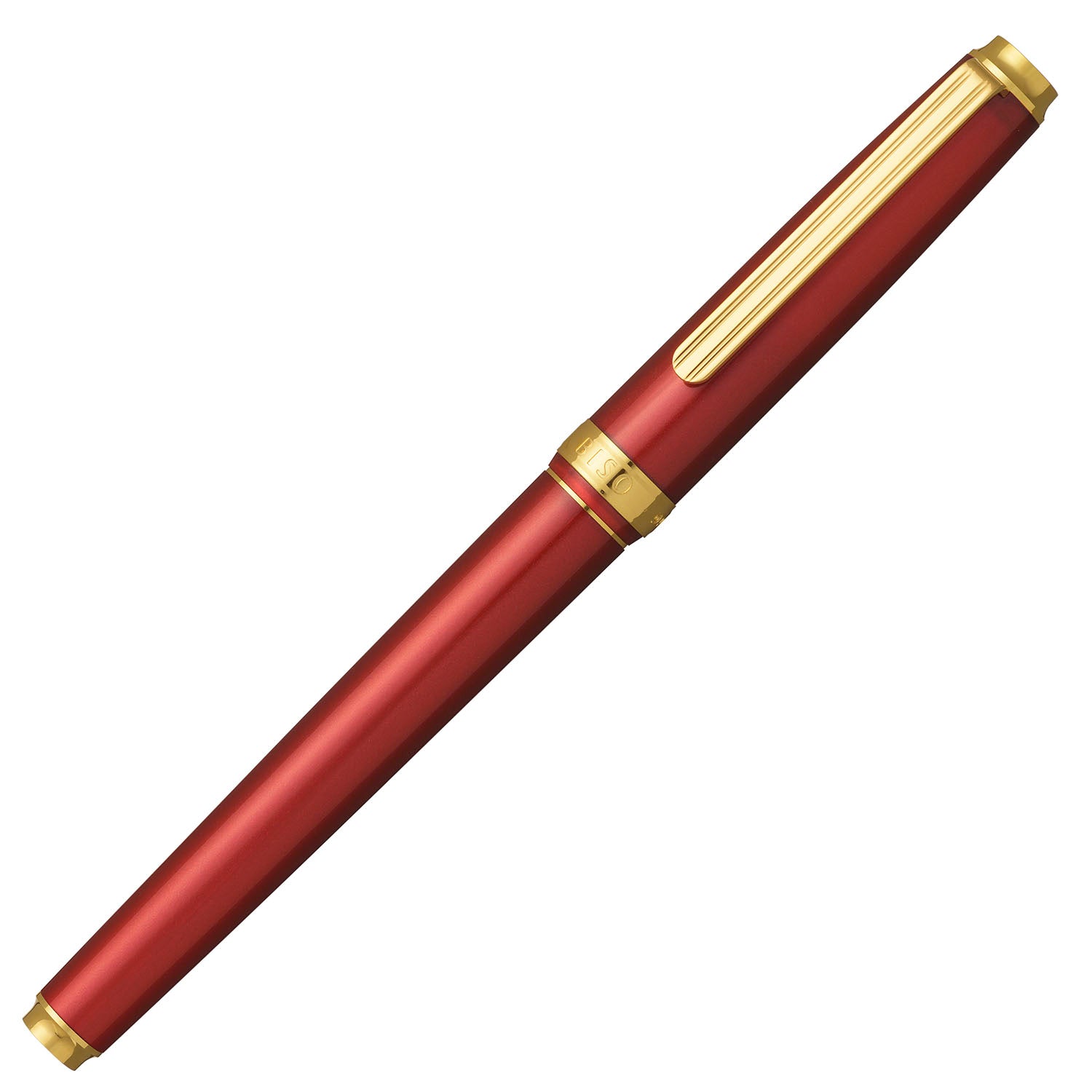 The body is made from a red pearlescent resin, which reveals subtle shifts in color depending on the angle and lighting. It comes with a smooth writing gold-plated steel nib and a Platinum ink cartridge (converter sold separately). We noticed when writing with it that this nib has more drag than most other nibs, so it will not glide as smoothly. It's not scratchy, it is just ground to a rougher finish. It works great for writers who really want to feel the paper under their nib. If you prefer smoother nibs, you should probably sit this one out.