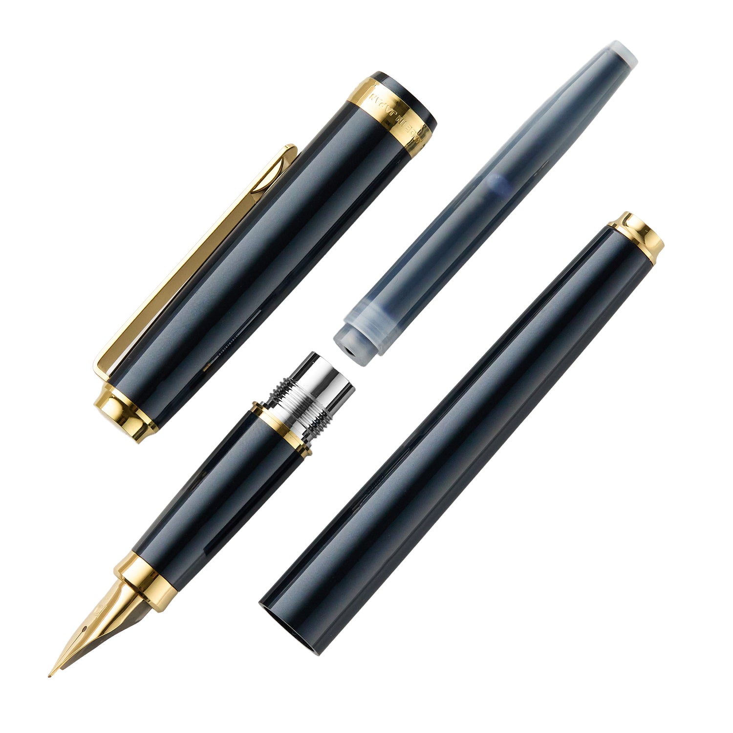 The body is made from a black pearlescent resin, which reveals subtle shifts in color depending on the angle and lighting. It comes with a smooth writing gold-plated steel nib and a Platinum ink cartridge (converter sold separately). We noticed when writing with it that this nib has more drag than most other nibs, so it will not glide as smoothly. It's not scratchy, it is just ground to a rougher finish. It works great for writers who really want to feel the paper under their nib. If you prefer smoother nibs, you should probably sit this one out.
