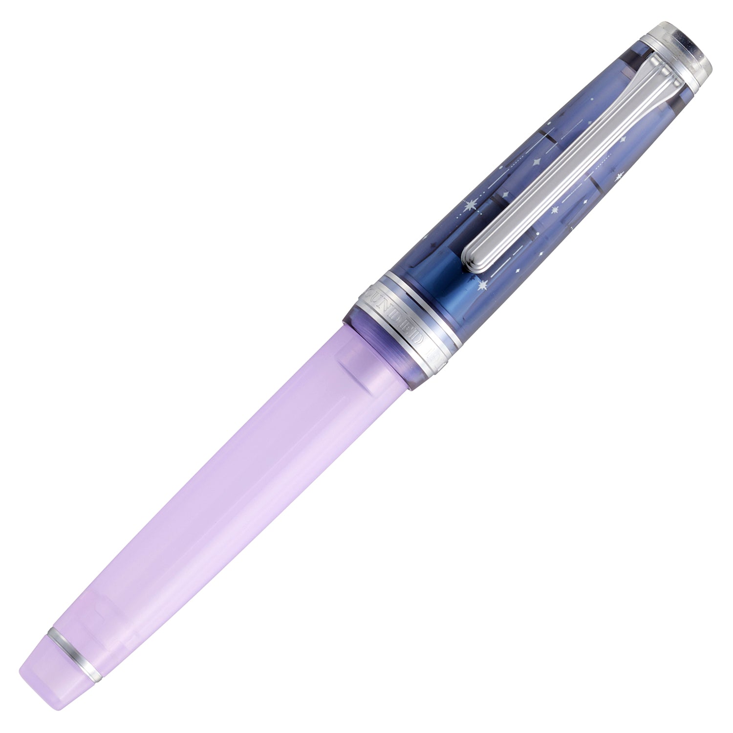 This Pro Gear Slim features a captivating translucent navy and purple limited edition color. This translucent resin allows the light to catch the deep, mysterious tones of the pen, evoking the atmosphere of twilight just before the stars appear. The pen is finished with rhodium-plated metal parts, perfectly complementing the cool color palette. It is fitted with Sailor's signature 14K solid gold nib (rhodium plated), available in three popular sizes: Extra Fine (EF), Medium Fine (MF), and Broad (B).