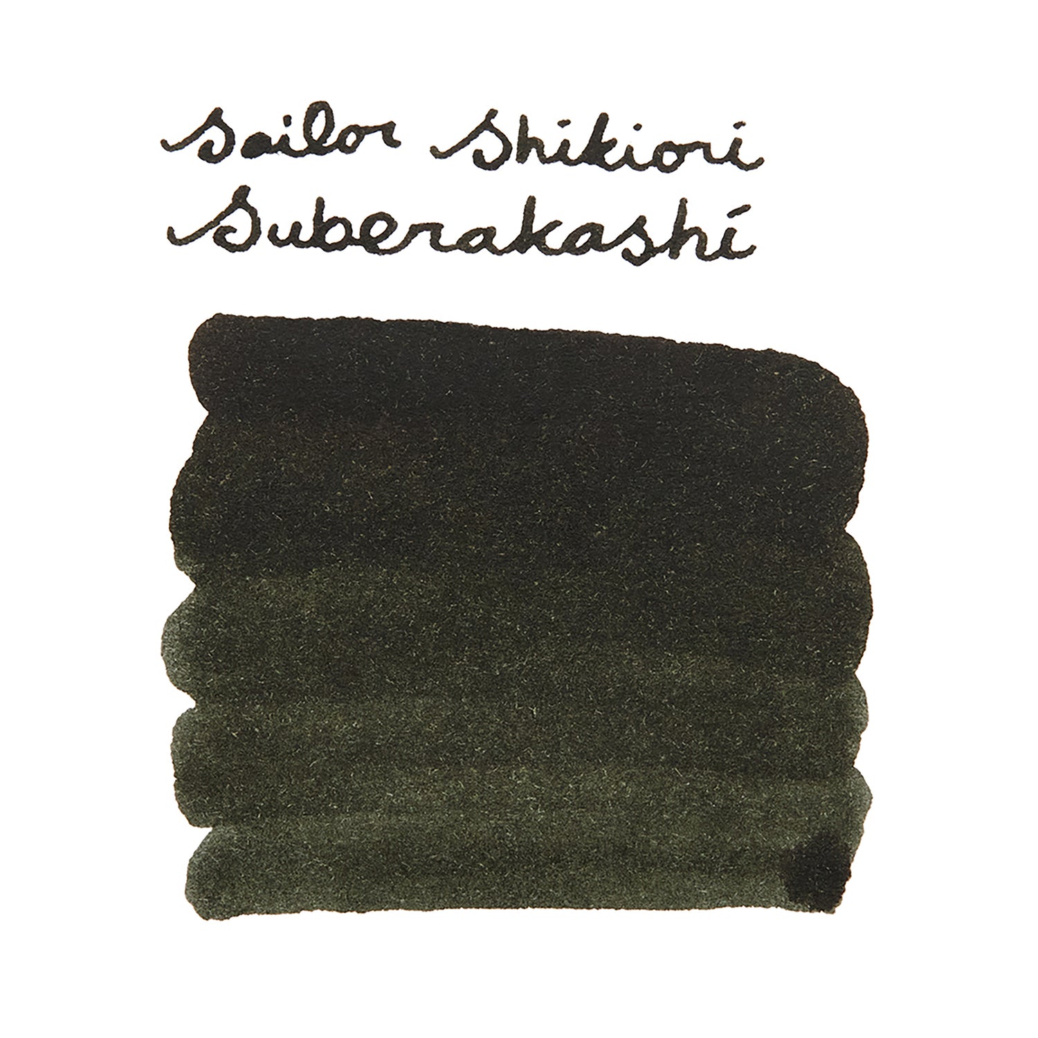 2ml sample of Sailor Shikiori Suberakashi (Princess' Headdress), a dark black-green fountain pen ink, in a labeled plastic vial.