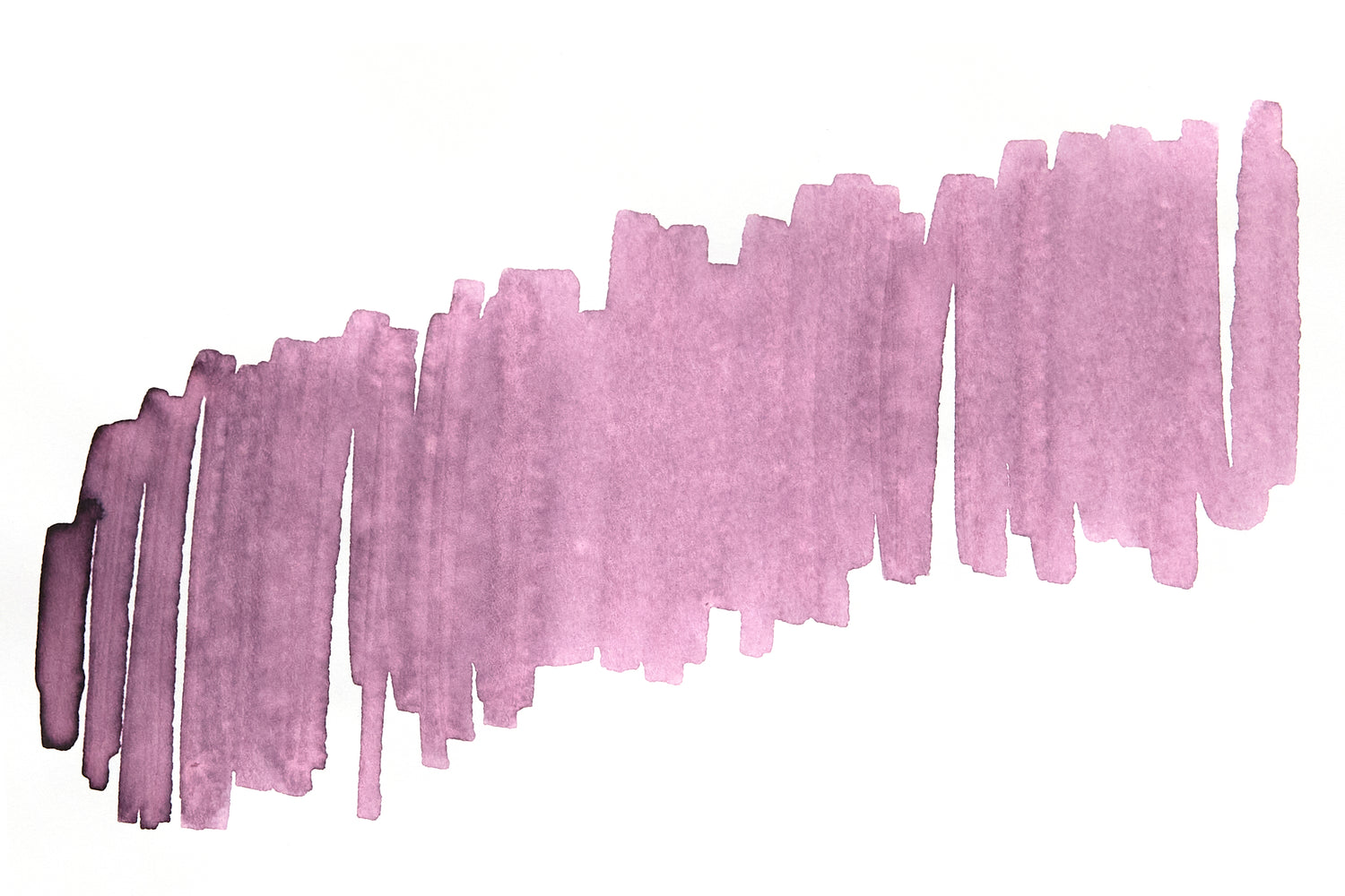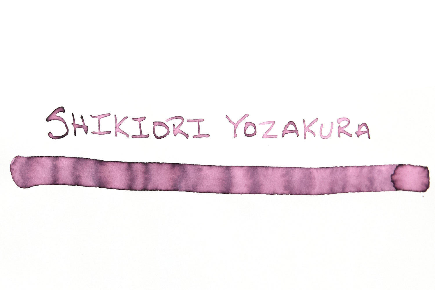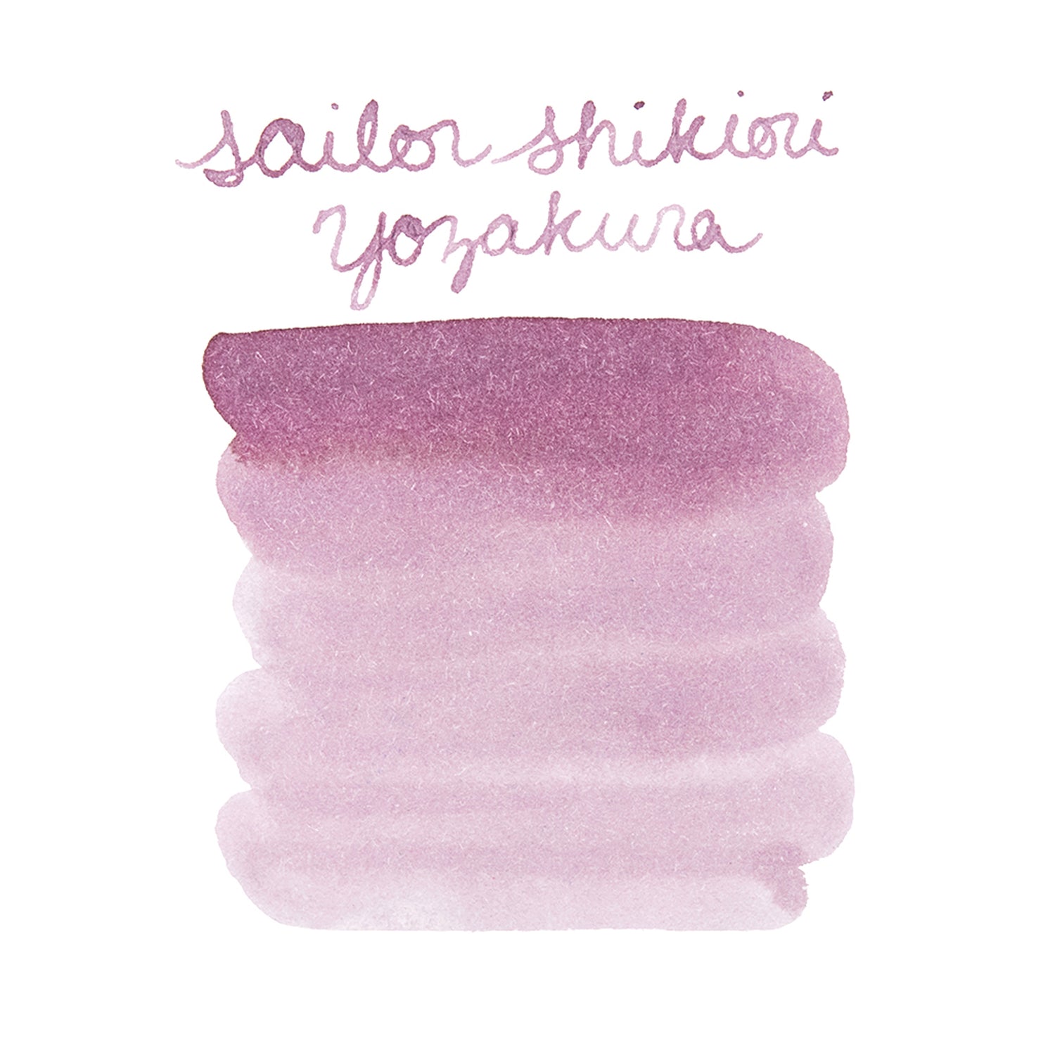 2ml sample of Sailor Shikiori Yozakura fountain pen ink, in a labeled plastic vial. Yozakura, or Evening Cherry Blossom, is a muted pastel pink/purple color.