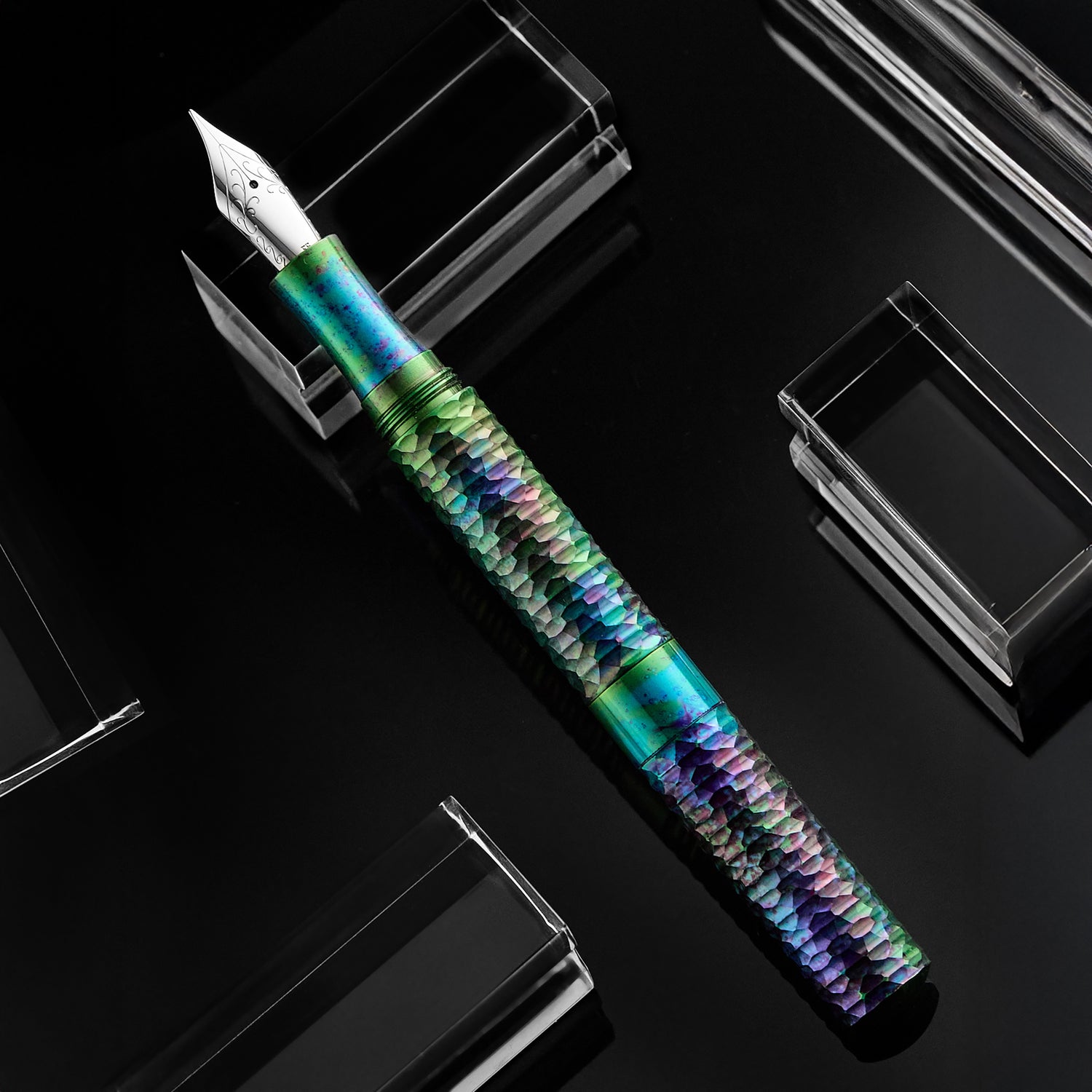 This Schon DSGN Faceted Pocket Six compact fountain pen features a green/purple/blue aluminum finish called "Bismuth Crystal" as it has faceted ridges on the body and cap.
