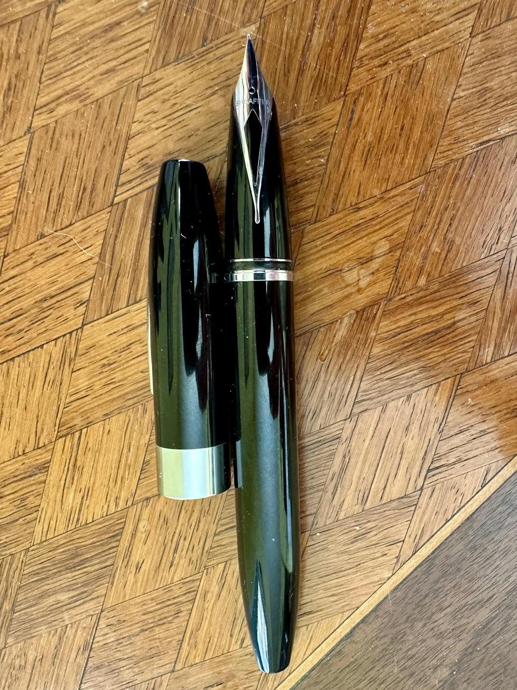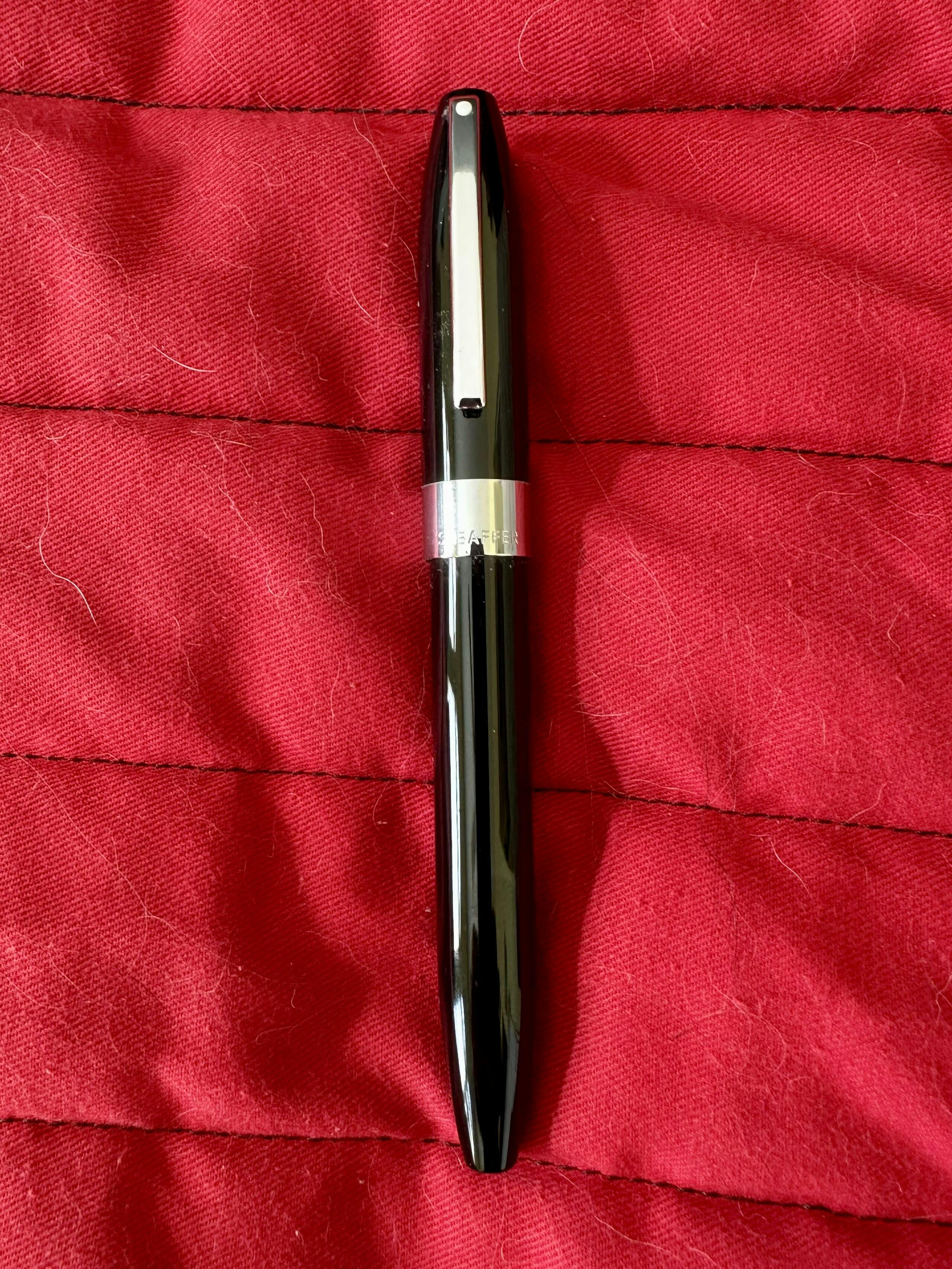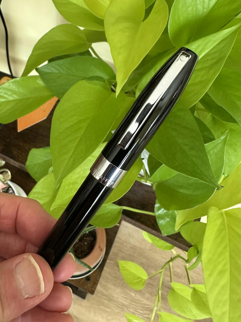 The fountain pen has a black lacquered body and cap and palladium-plated trim. It comes in a gift box with a proprietary Sheaffer converter as well as Sheaffer ink cartridges and a leather pouch.